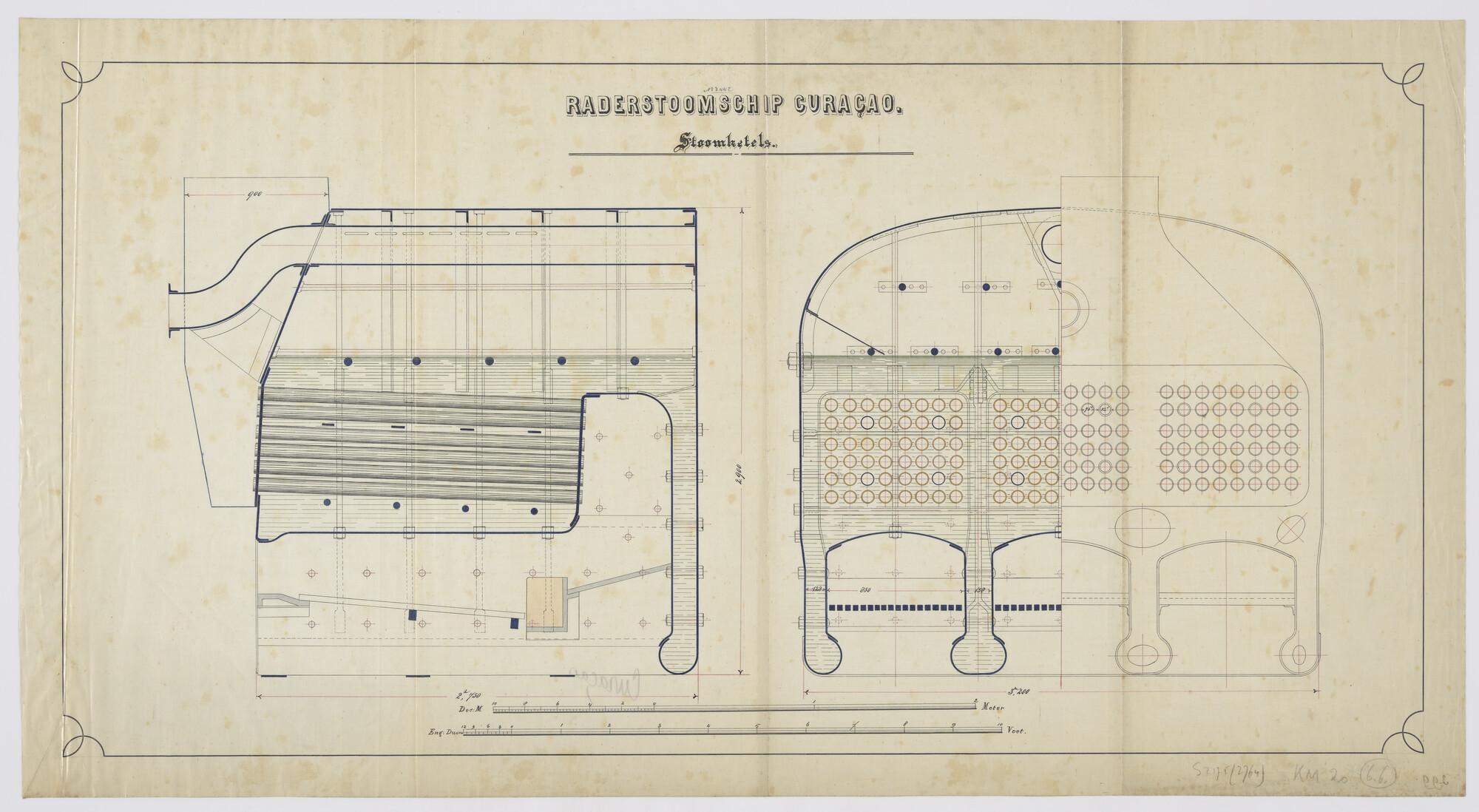 Plan tot het bouwen van het raderstoomschip "Curaçao" voor de passagiersdienst in de kolonie Suriname. Langsdoorsnede en dwarsdoorsnede over de stoomketel - vierkant vlamtype met drie rechthoekige vuurhaarden met alleen ketelwater in de zijden (schaal 1:10).
