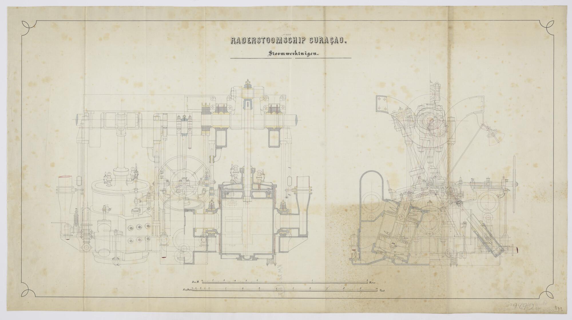 Plan tot het bouwen van het raderstoomschip "Curaçao" voor de passagiersdienst in de kolonie Suriname. Langsdoorsnede en dwarsdoorsnede over de stoommachine - 2 cilinder oscillerende machine. Of dit schip daadwerkelijk is gebouwd is niet zeker (schaal 1:10).