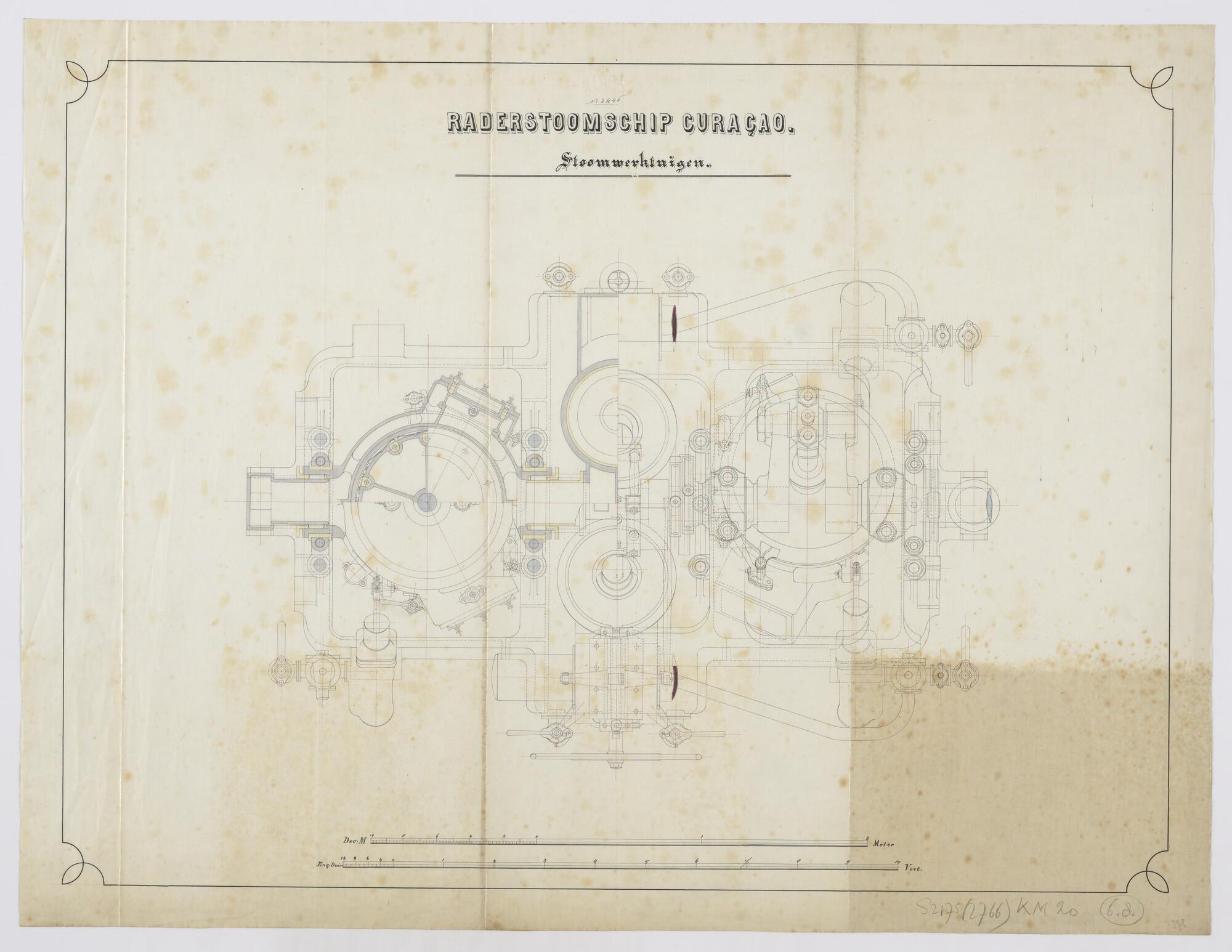 Plan tot het bouwen van het raderstoomschip "Curaçao" voor de passagiersdienst in de kolonie Suriname. Bovenaanzicht over de stoommachine - 2 cilinder oscillerende machin. Of dit schip daadwerkelijk is gebouwd is niet zeker (schaal 1:10).