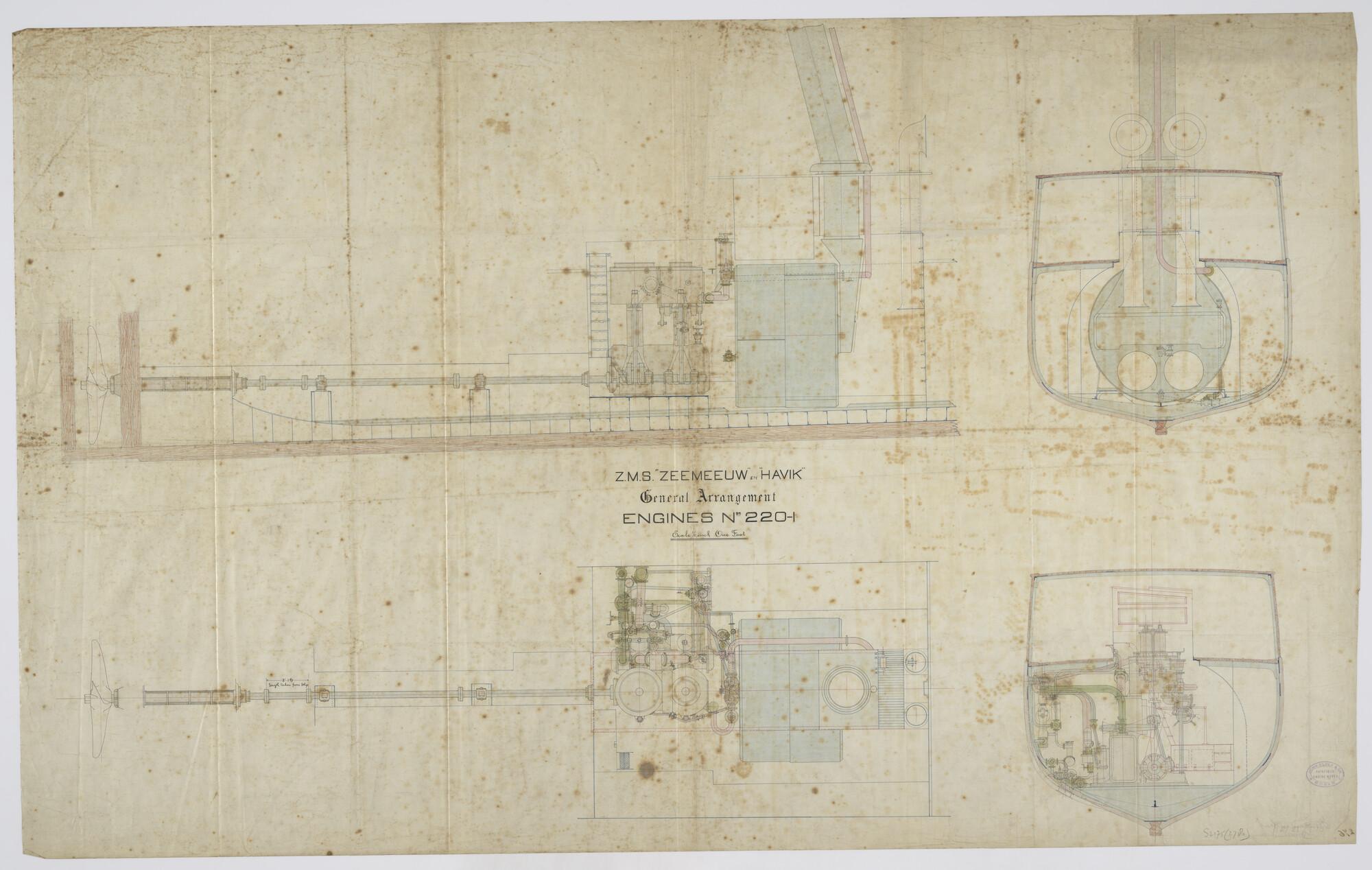Verticale- en horizontale langsdoorsnede van de schroefstoomschepen Zr.Ms. Havik en Zeemeeuw