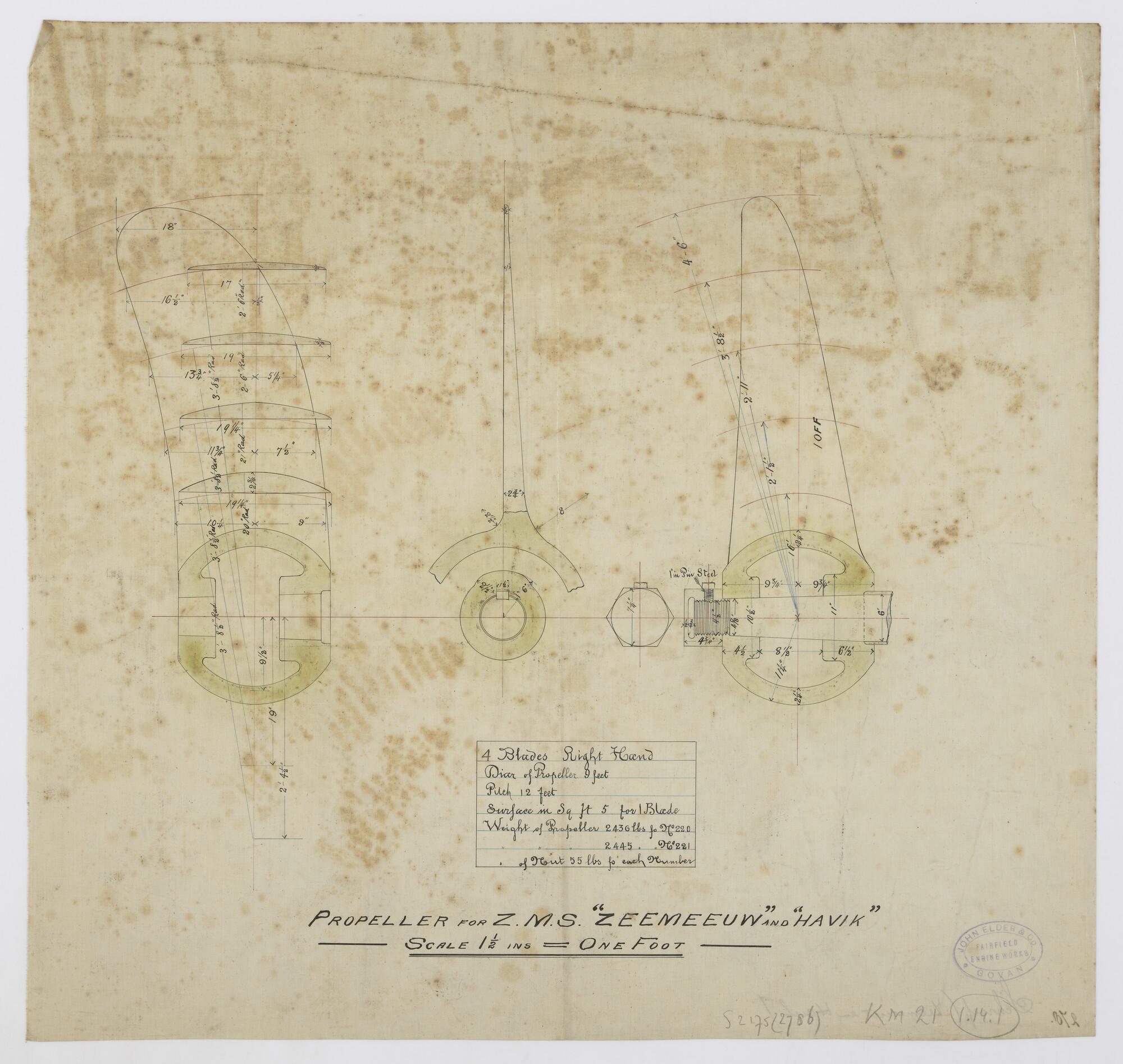 Drie doorsneden van de vier bladige rechtsdraaiende schroef van de schroefstoomschepen voor de Gouvernementsmarine Zr.Ms. "Havik" en Zr.Ms. "Zeemeeuw". Overzicht van technische gegevens (schaal 1½ inches = 1 foot).