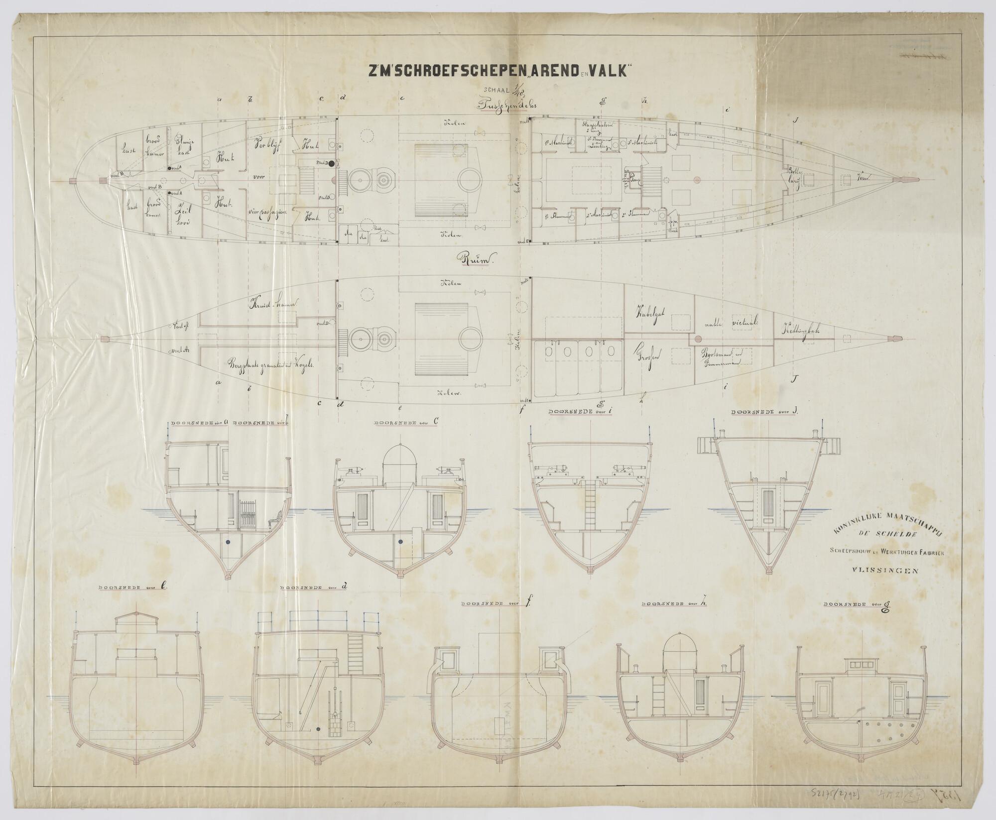 Indelingstekening van het tussendek en van het ruim alsmede 9 dwarsdoorsneden van de schroefstoomschepen voor de Gouvernementsmarine Zr.Ms. "Arend" en Zr.Ms. "Valk". Accommodatie voor vier passagiers op het tussendek achteruit (schaal 1/48).