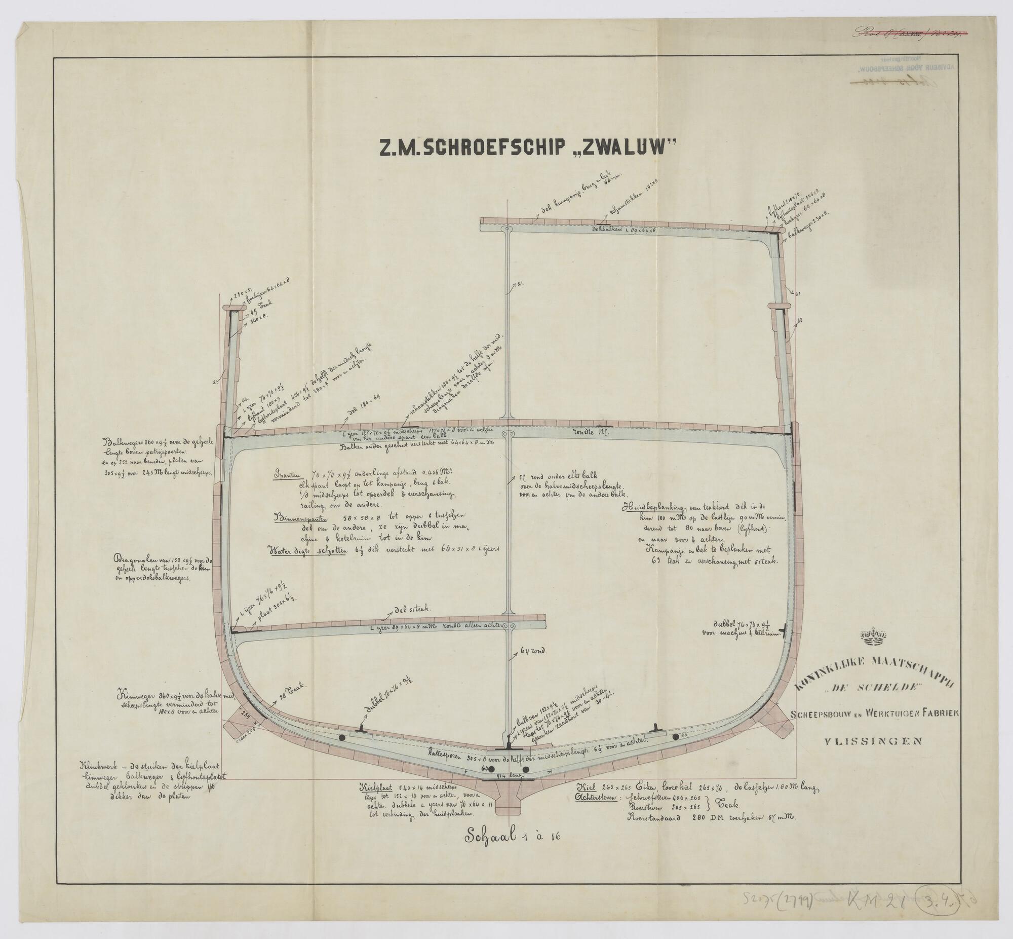 Het schroefstoomschip voor de Gouvernementsmarine Zr.Ms. "Zwaluw". Dwarsdoorsnede over het grootspant met kampanje-, brug- of bakdek, bovendek en tussendek. IJzeren dekken met teak hout belegd, verschansing, kimkielen, kielplaat (schaal 1:1/16).