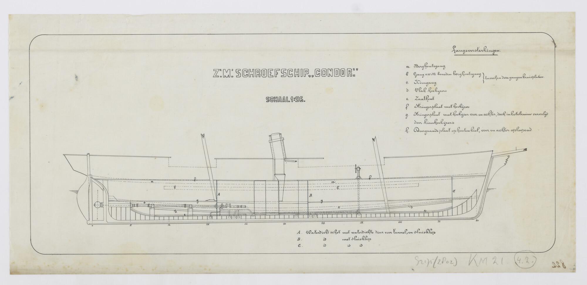 Langsscheepse doorsnede tot op de kiel met langsversterkingen, drie waterdichte schotten, schroefas met schroef van het schroefstoomschip voor de Gouvernementsmarine Zr.Ms. "Condor" (schaal 1/96).