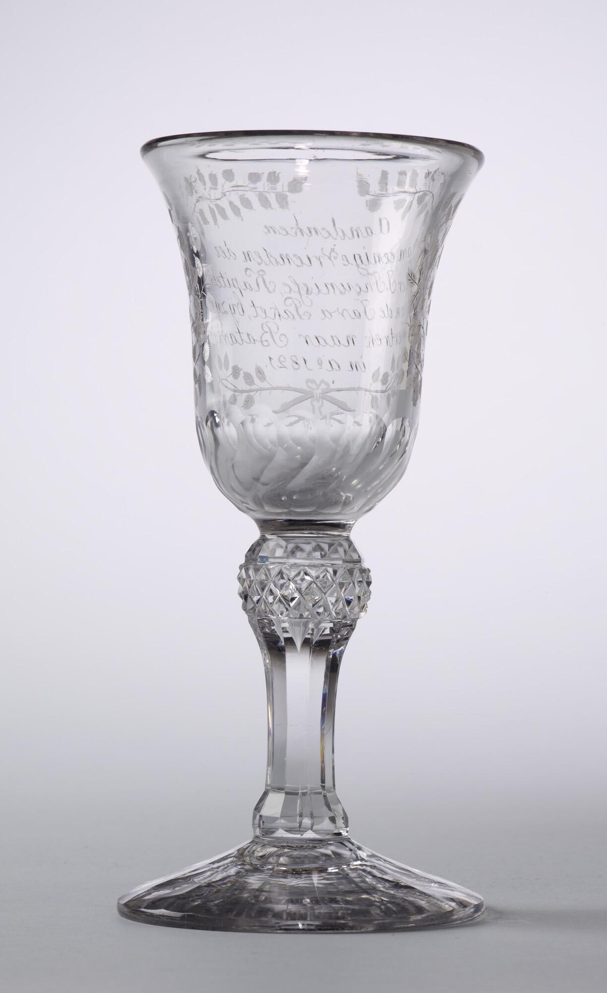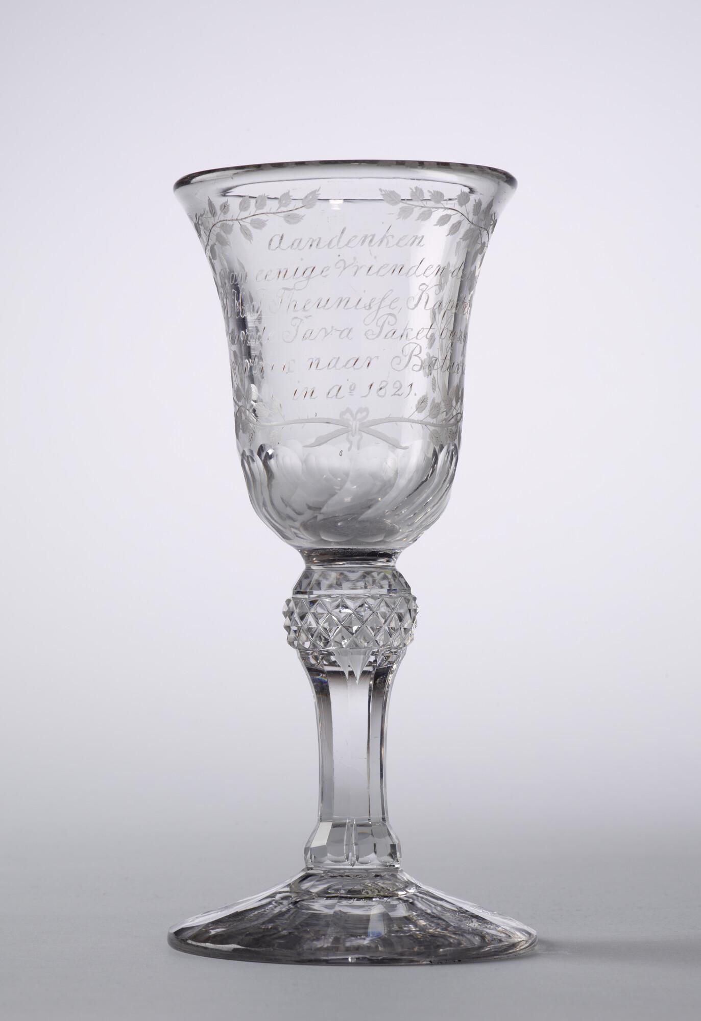 Boheems wijnglas met een radgravure van rozentakken en het opschrift: 'Aandenken van eenige vrienden der heer J. Theunisse Kapitein van de Java Paket bij zijn vertrek naar Batavia in Ao. 1821'.