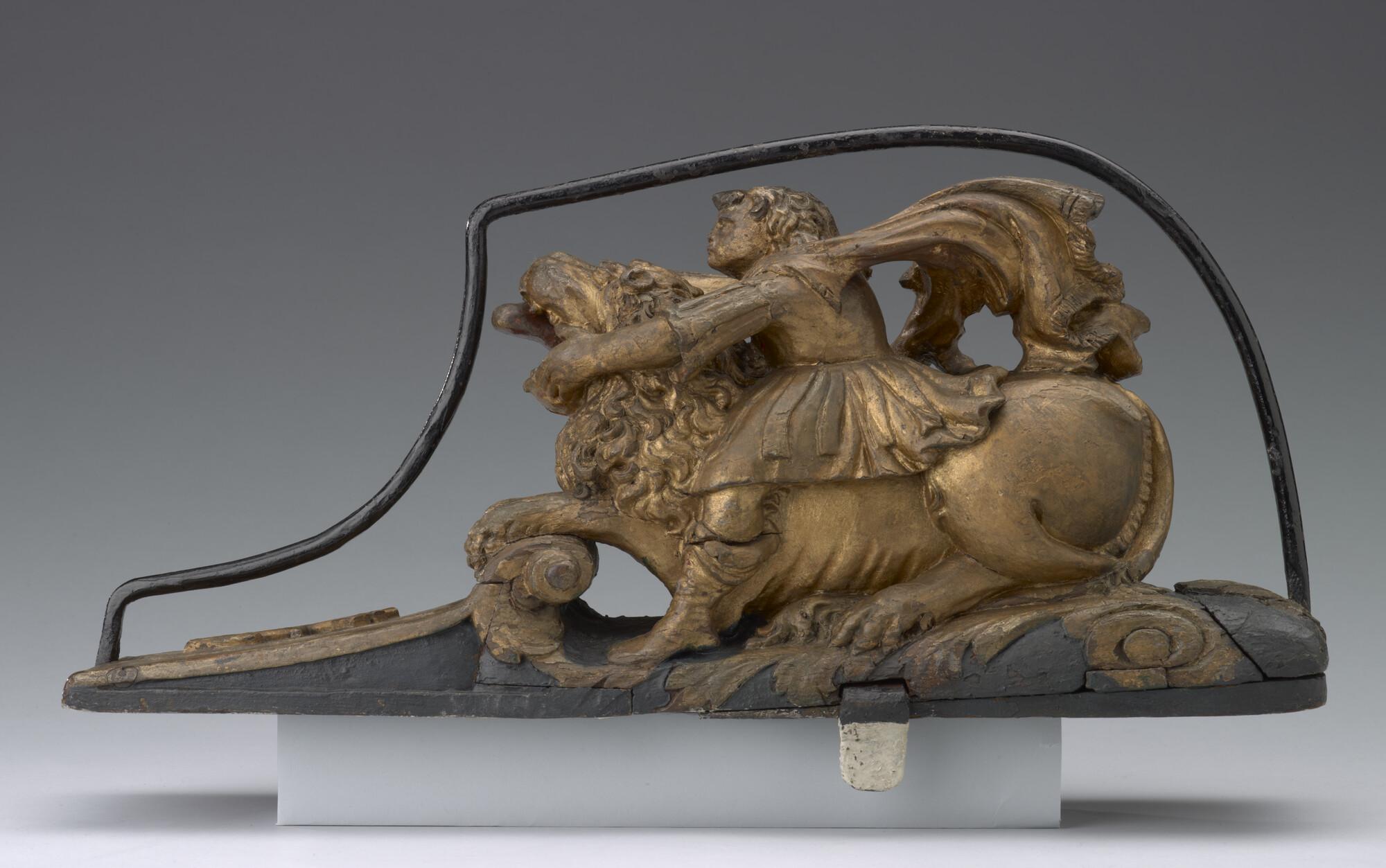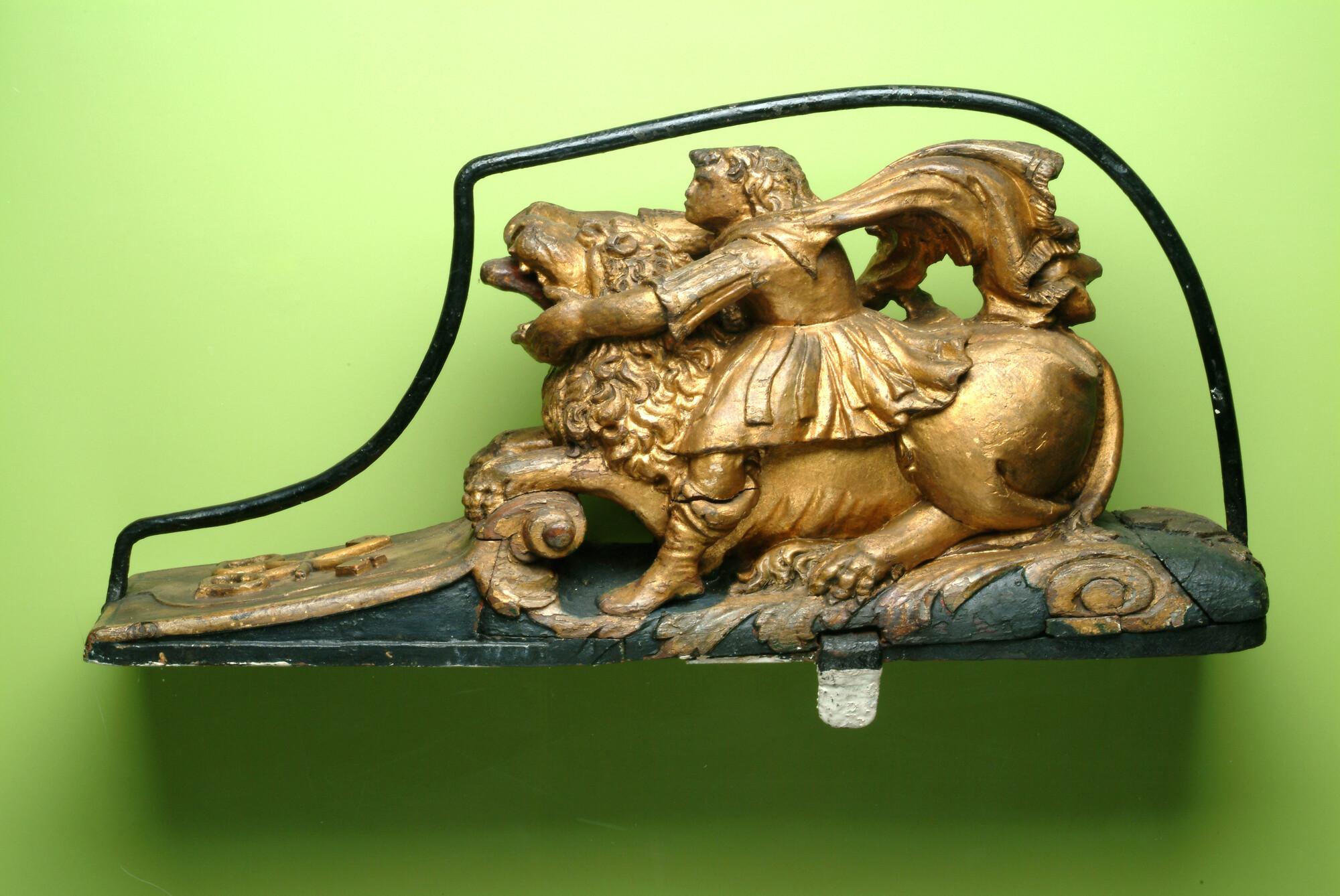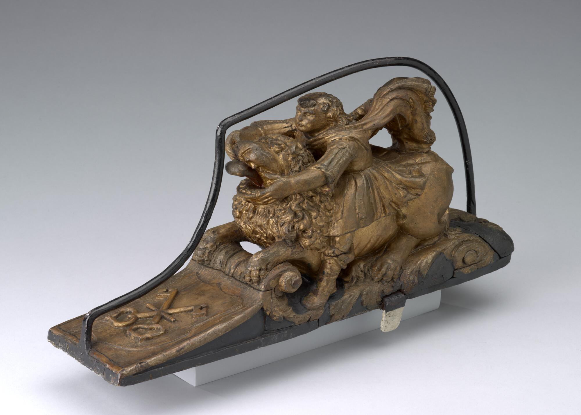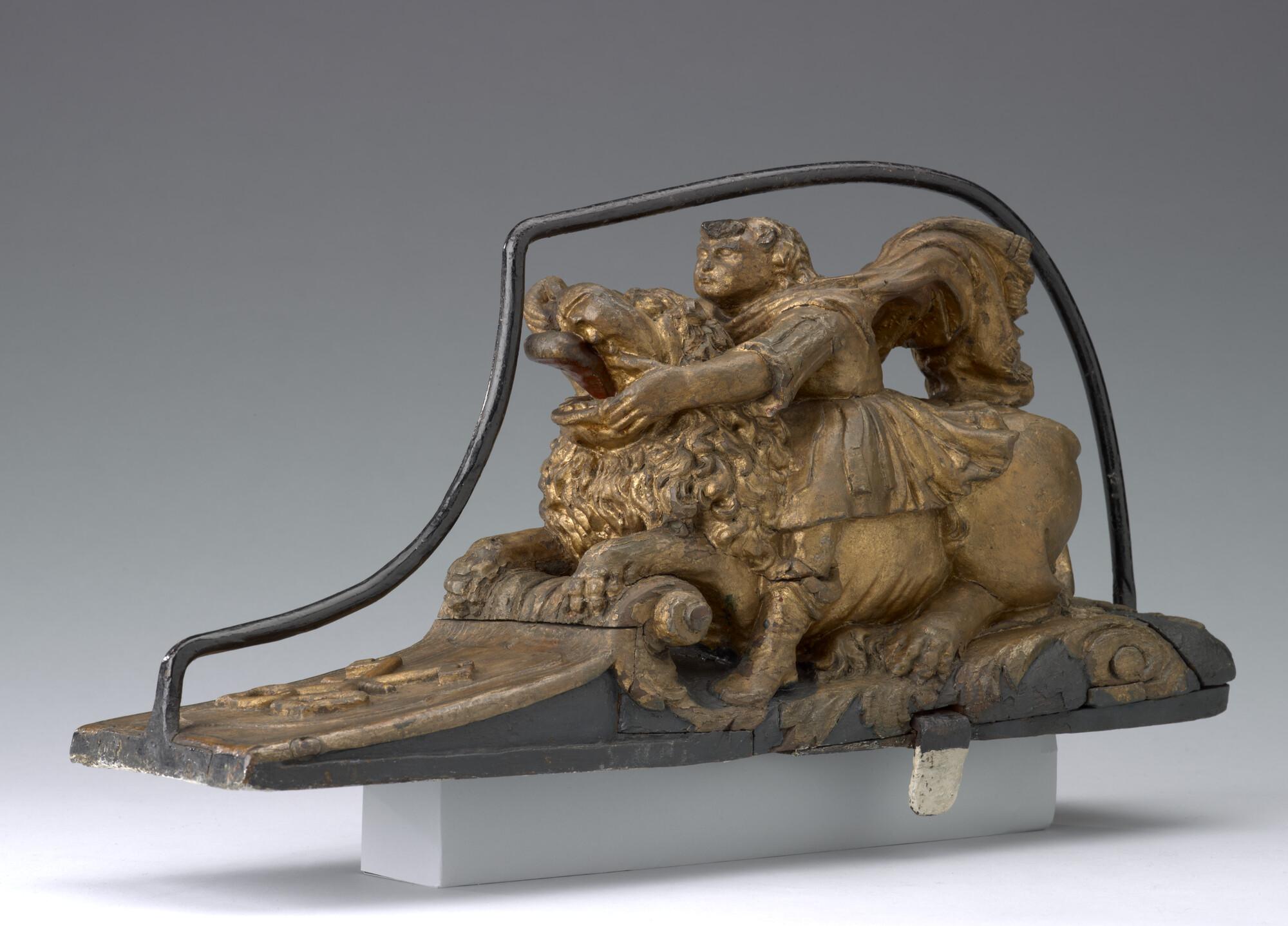 Roerkop in de vorm van Samson zittend op de rug van een leeuw met zijn armen om diens nek. Op het voorstuk staat het stadwapen van Leiden. Van voor naar achter overbrugd door metalen stang.