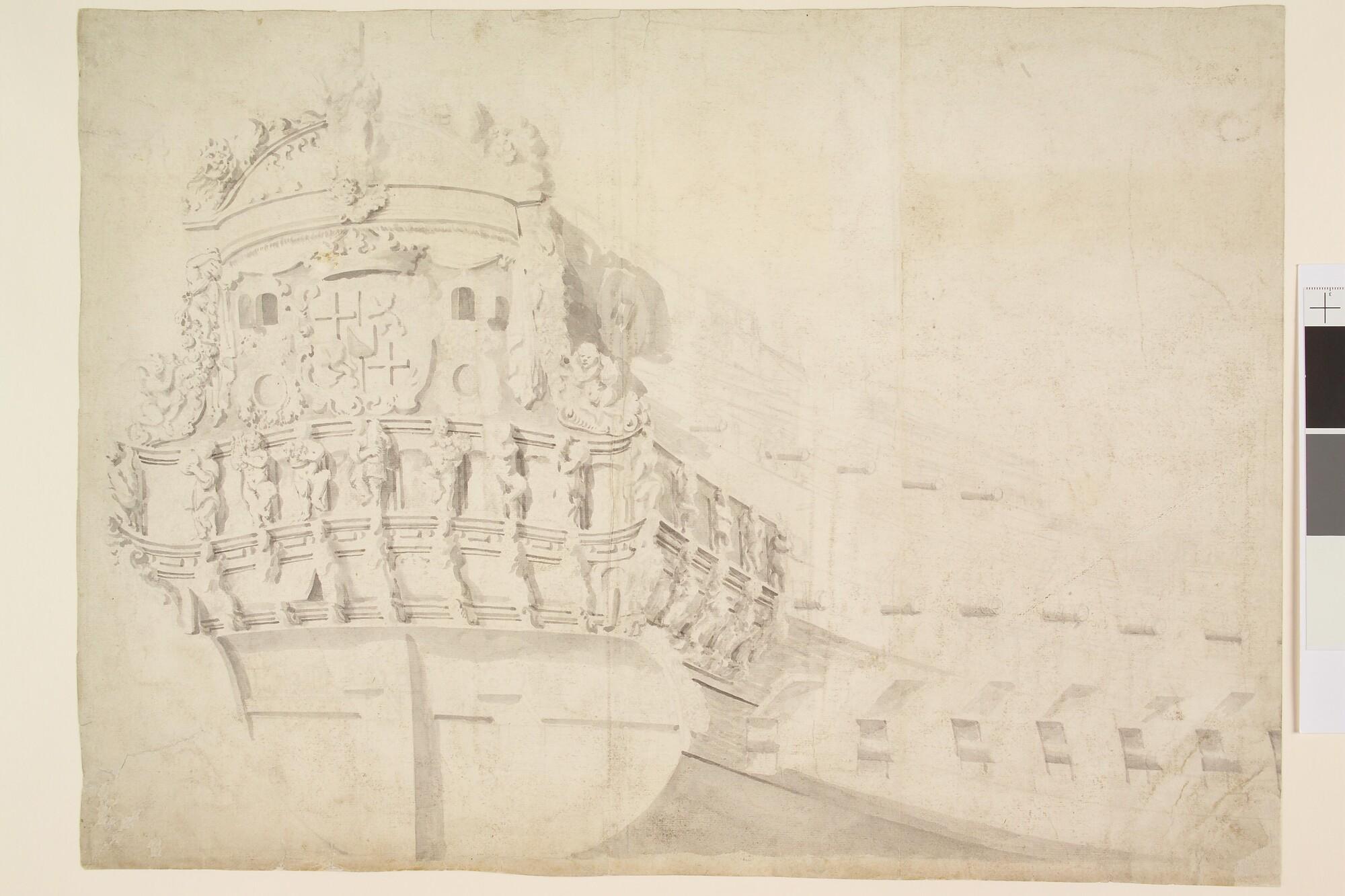 Het oorlogsschip Utrecht gezien op de spiegel en stuurboordzijde.
