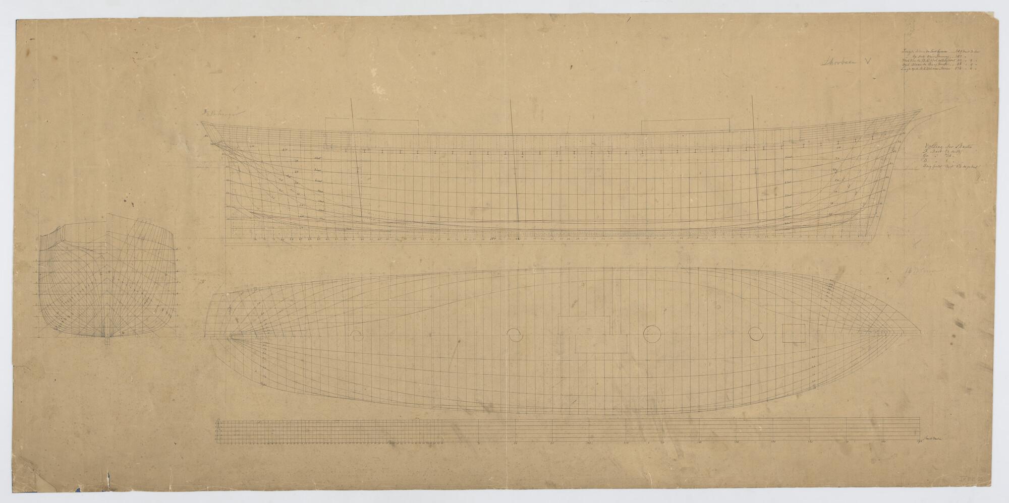 Lijnentekeningen van de bark Thorbecke V, 1883.