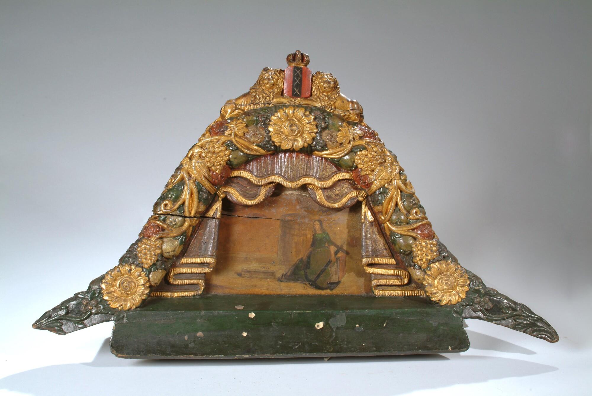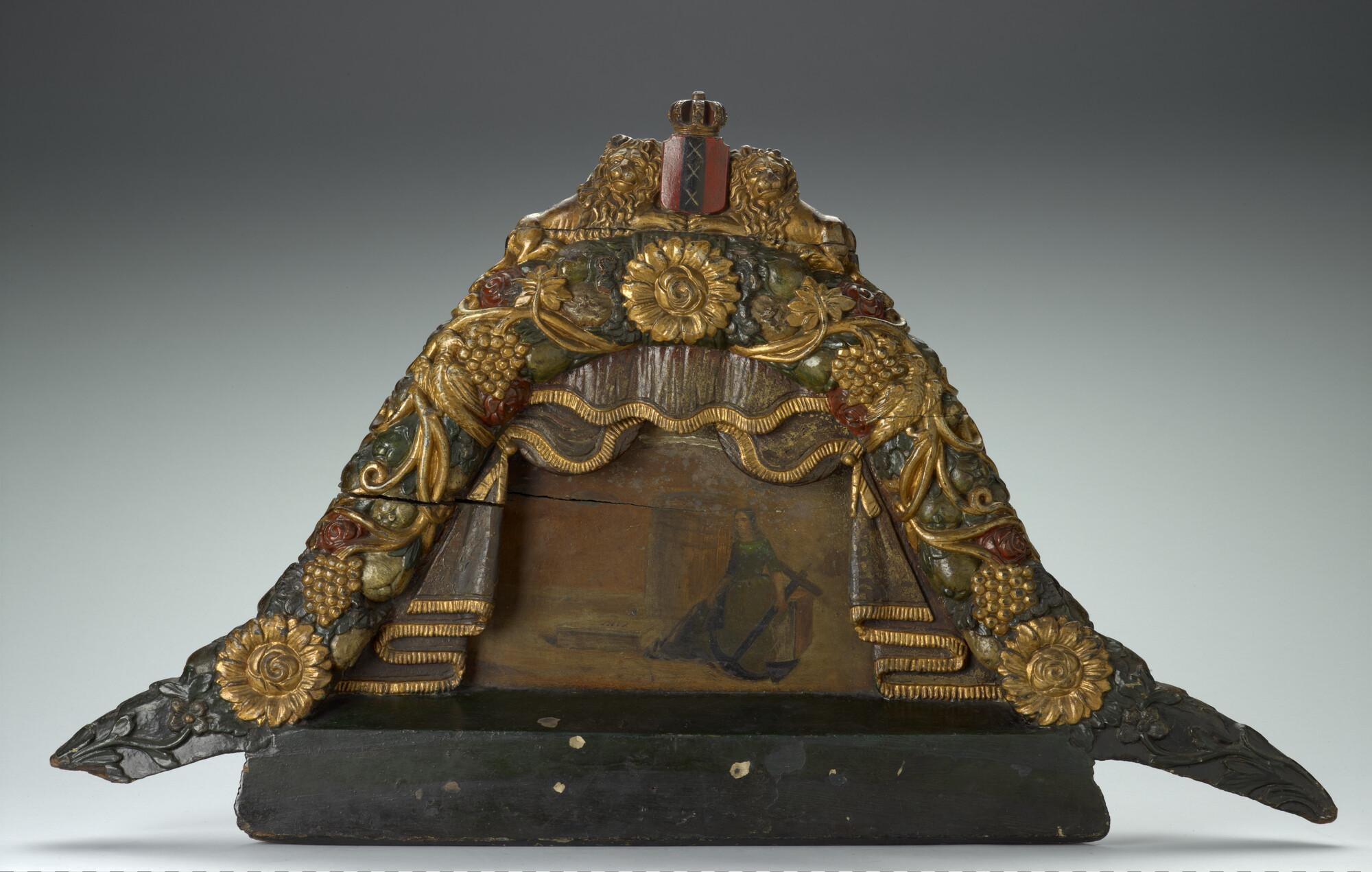 Hakkebord gedecoreerd met een geschilderde voorstelling van een zittende vrouw.