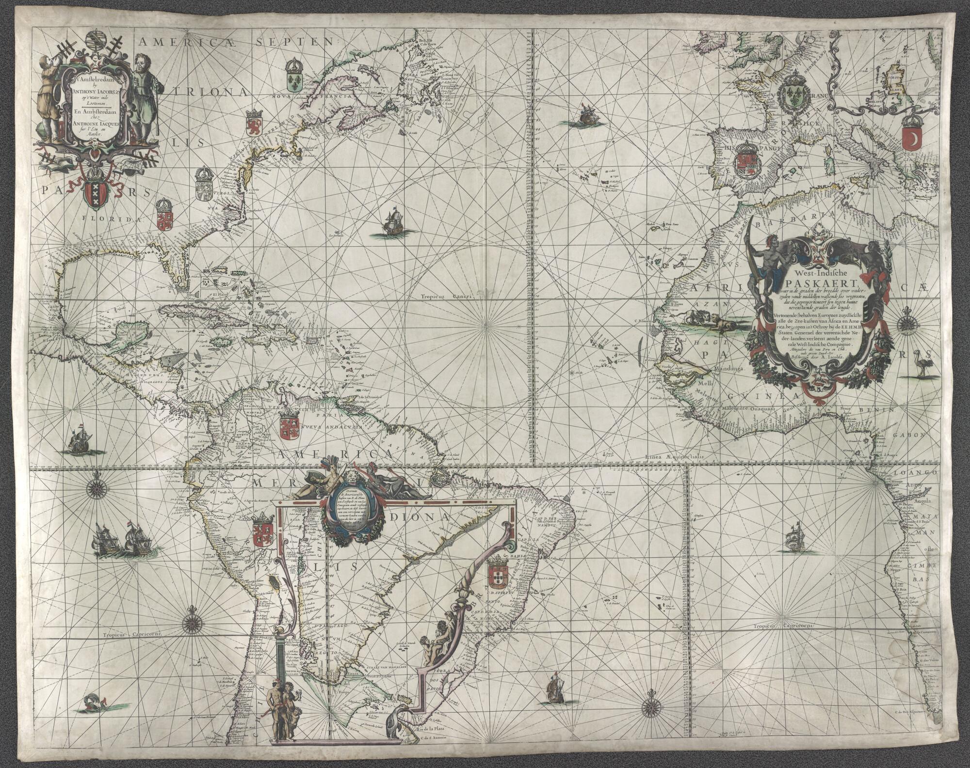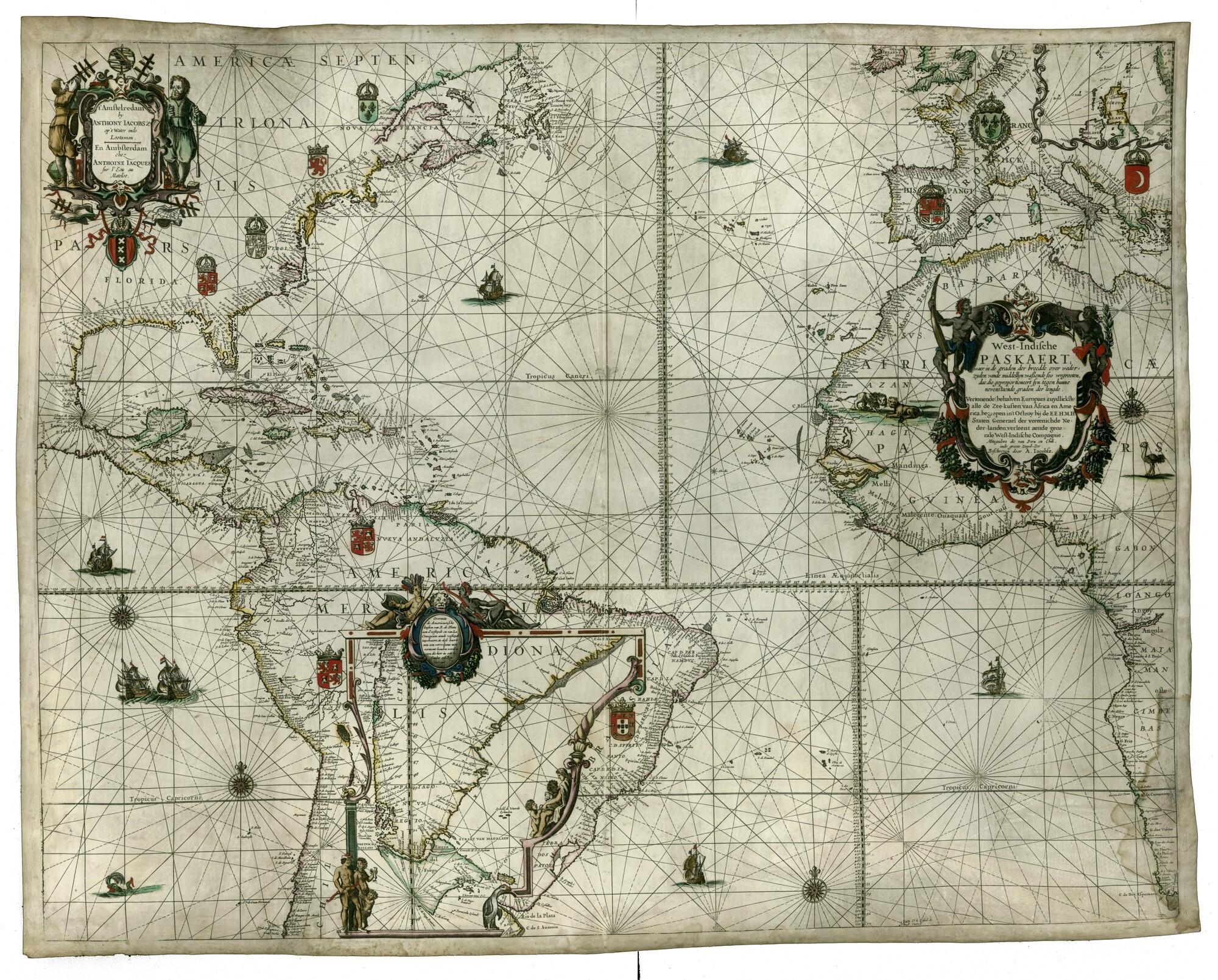Met de hand gekleurde Westindische, gedrukte paskaart door Anthonie Jacobsz, Amsterdam, circa 1649. Mercator projectie. en inzetkaart van Noord-Engeland, Schotland en het noorden van Ierland. De Westindische Paskaart werd als type kaart werd het eerst uitgebracht door Willem Jansz. Blaeu in ca. 1630. schaal 1 op 16000000.
