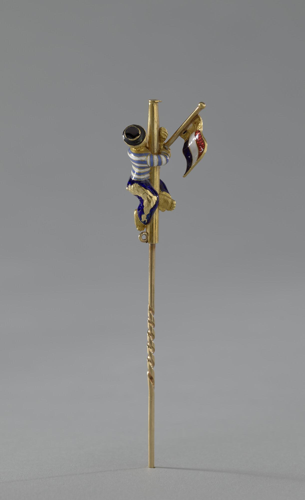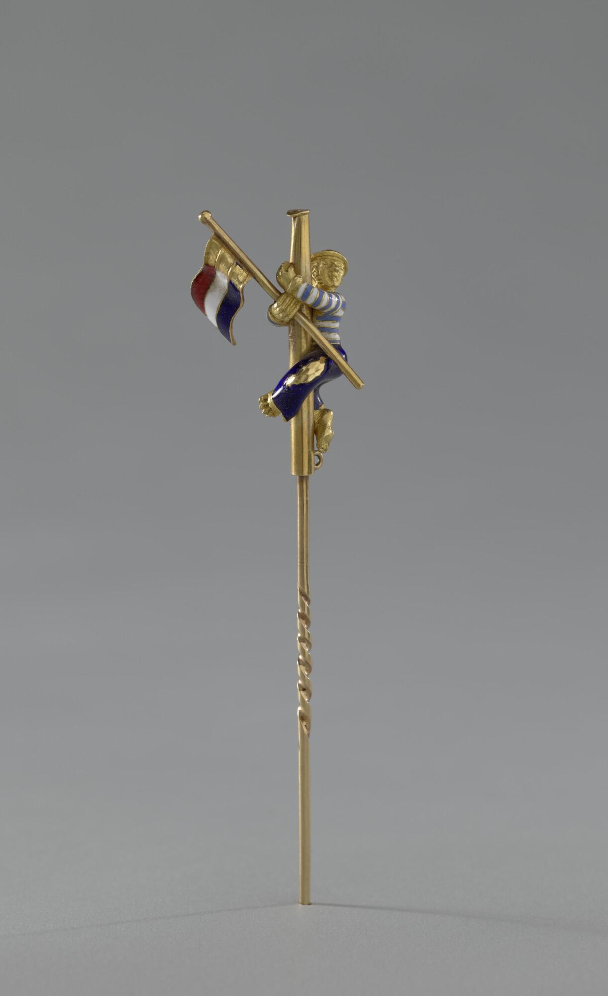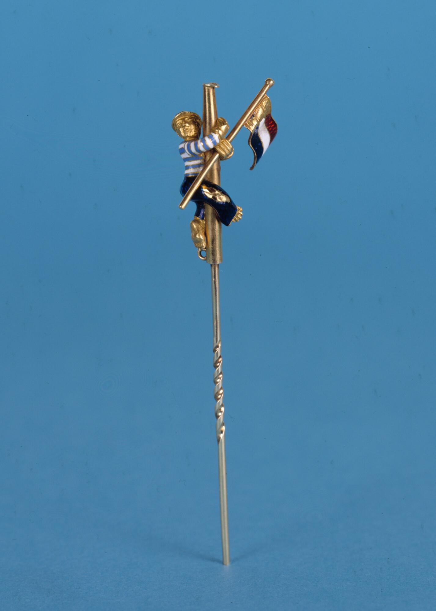 Doekspeld door Koning Willem III geschonken aan Vice-Admiraal James May. De speld in de vorm van een masttop met bovenin een matroos met de Nederlandse vlag. Geëmailleerd.