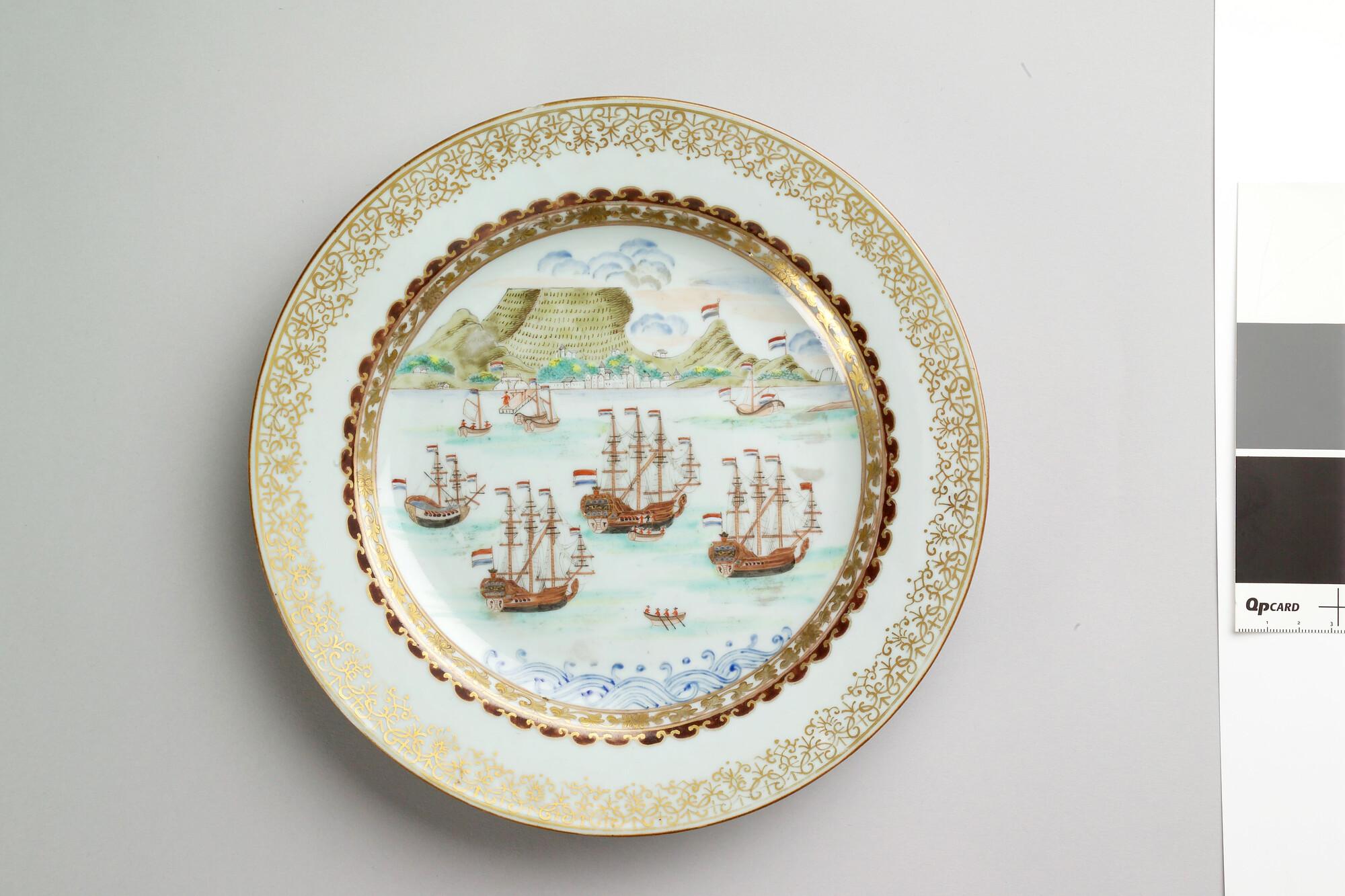 Bord van Chinees porselein (Chine de Commande), met op het plat een voorstelling van de Tafelbaai met een voor anker liggend Nederlands eskader. Rond het plat in goud een floraal motief en een ruyi-rand. Langs de rand van het bord een goudkleurig rankenpatroon in Meissen-stijl.