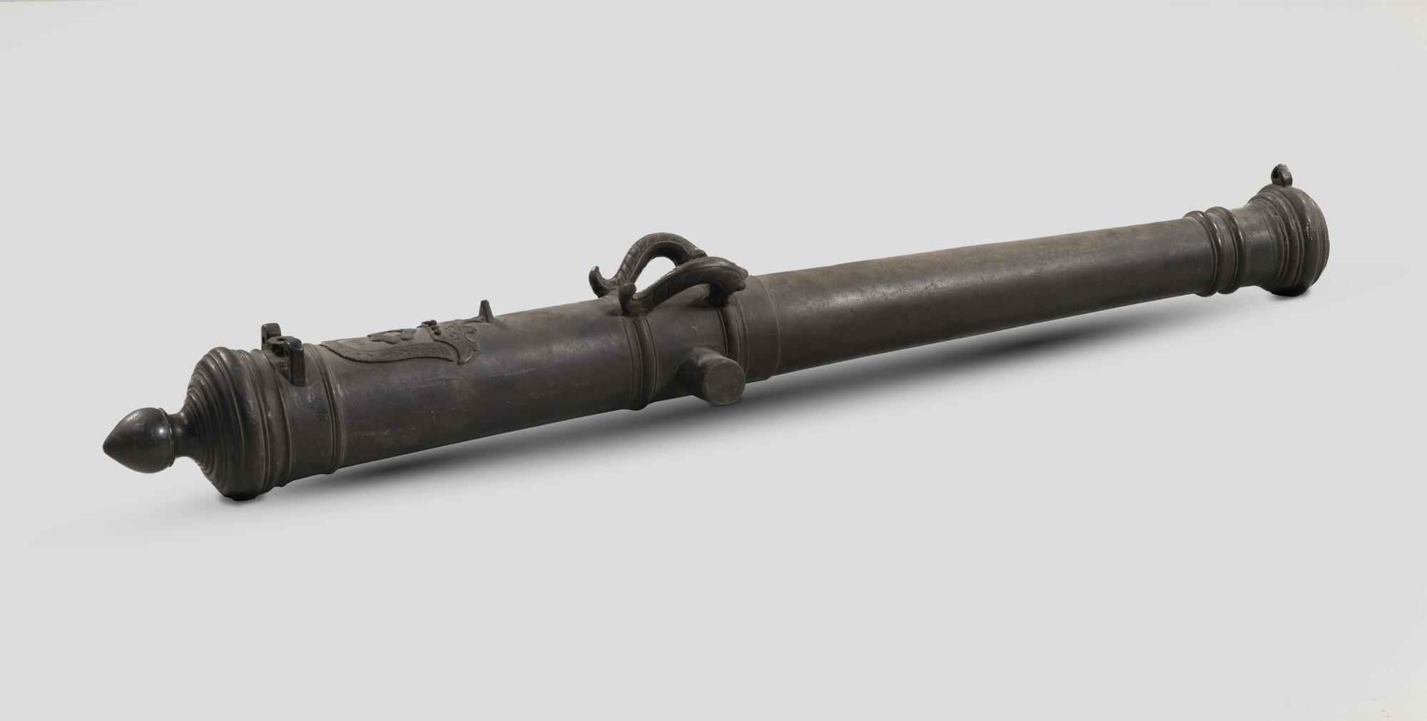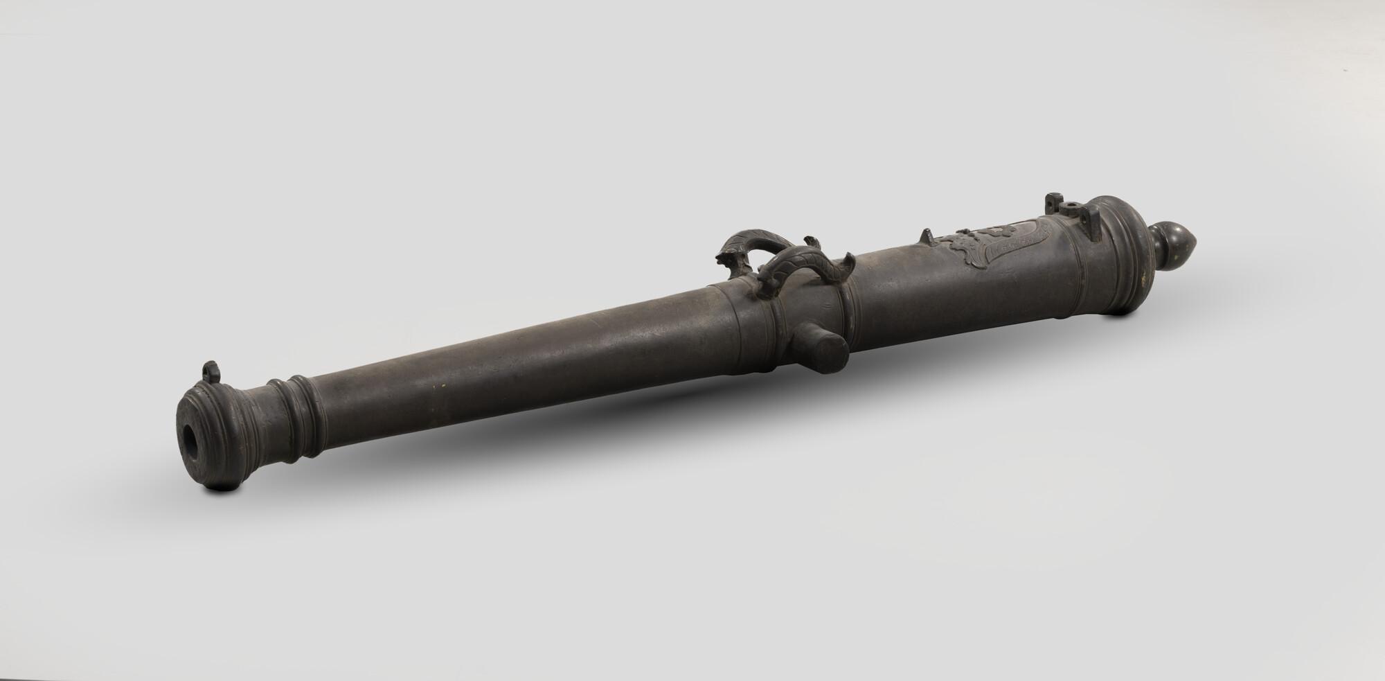 Scheepskanon, met twee oren en twee viziernokken, voor het zundgat een bloemmotief.
