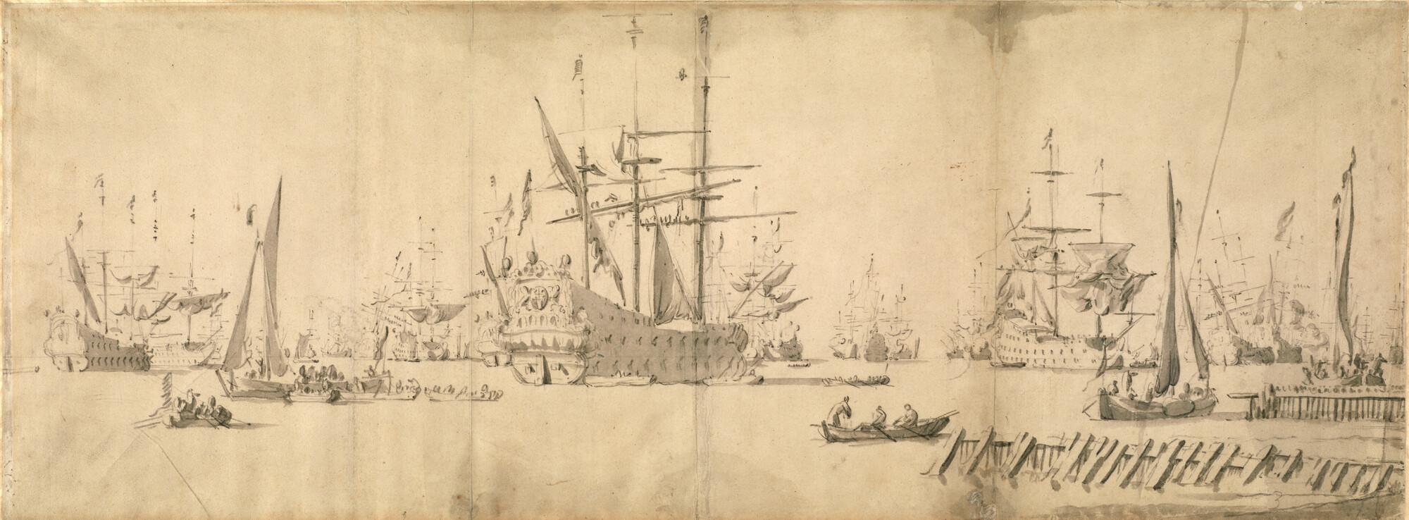 Gedeelte van de Nederlandse vloot onder luitenant-admiraal Van Wassenaer van Obdam ter rede van Texel, waar zij in gereedheid wordt gebracht voor de slag bij Lowestoft. Rechts een havenhoofd (Nieuwe Diep?), links van het midden een groot oorlogsschip met op de spiegel het wapen van Rotterdam.
