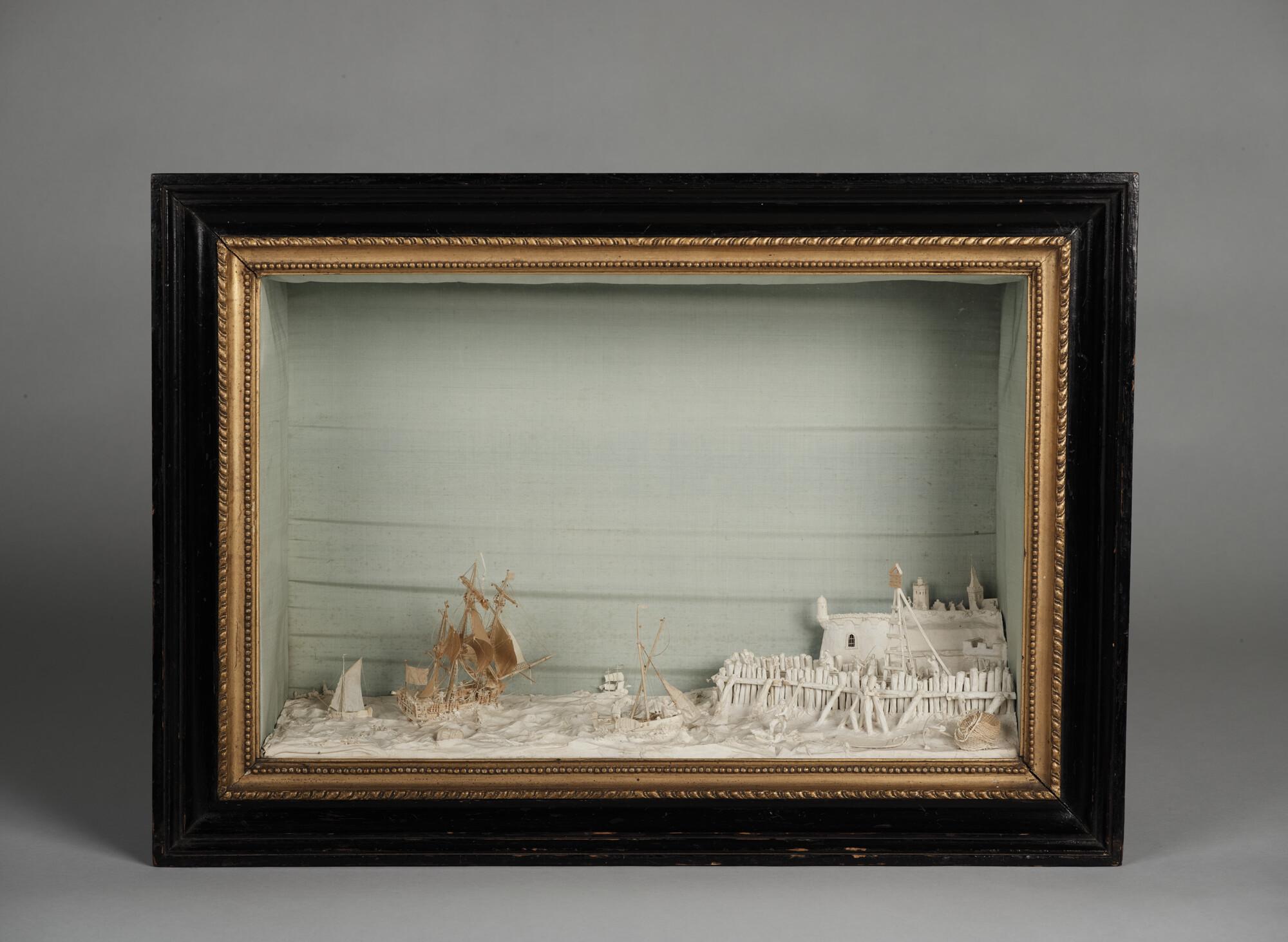Diorama voorstellend een Hollandse rede met haven en ondermeer een fregat en een binnenvarend vissersvaartuig.