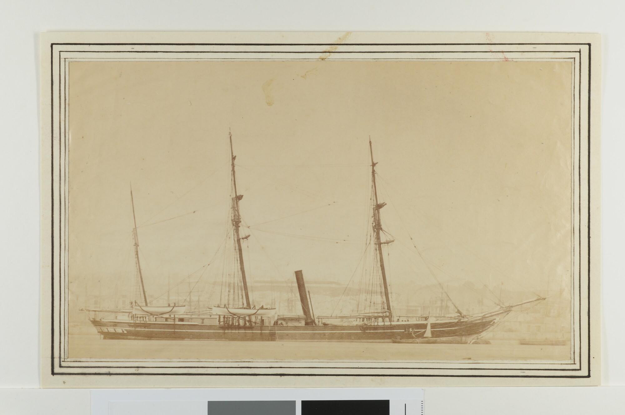 Gezicht op de "Pandora" bakboordaanzicht liggend in een onbekende haven.