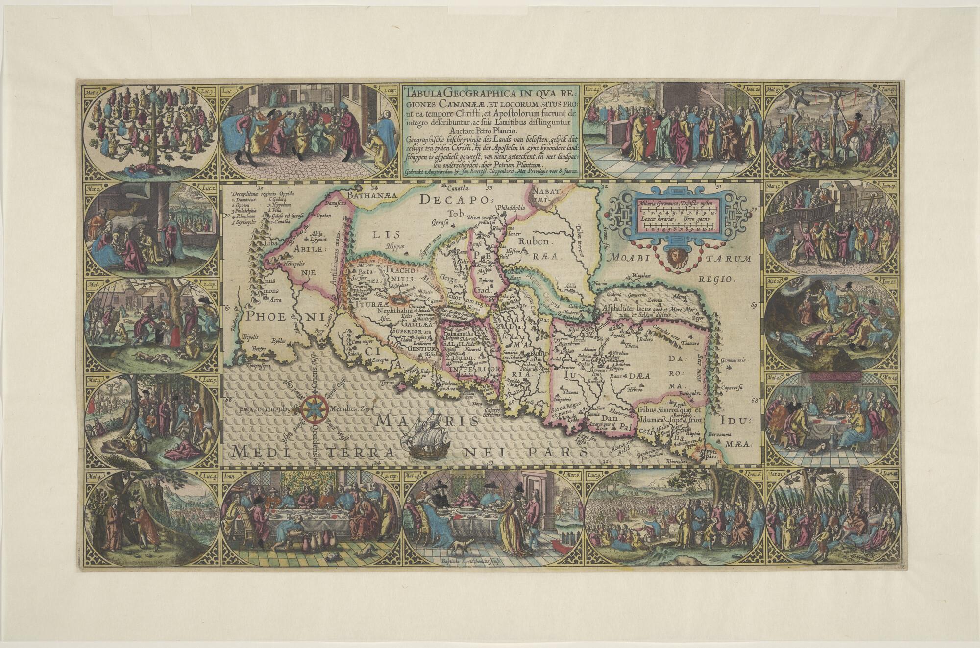 Met de hand gekleurde kaart van Kanaan door Petrus Plancius (1552-1622). Uitgave Jan Evertsz. Cloppenburg, Amsterdam, circa 1604. Omrand met 15 bijbelse prenten (schaal 1 op 1.200.000).