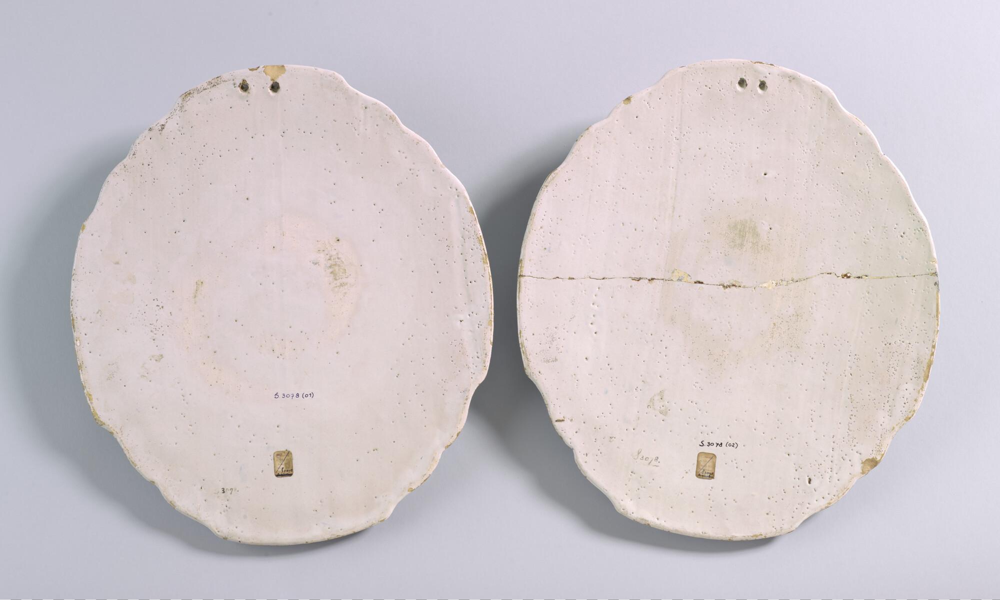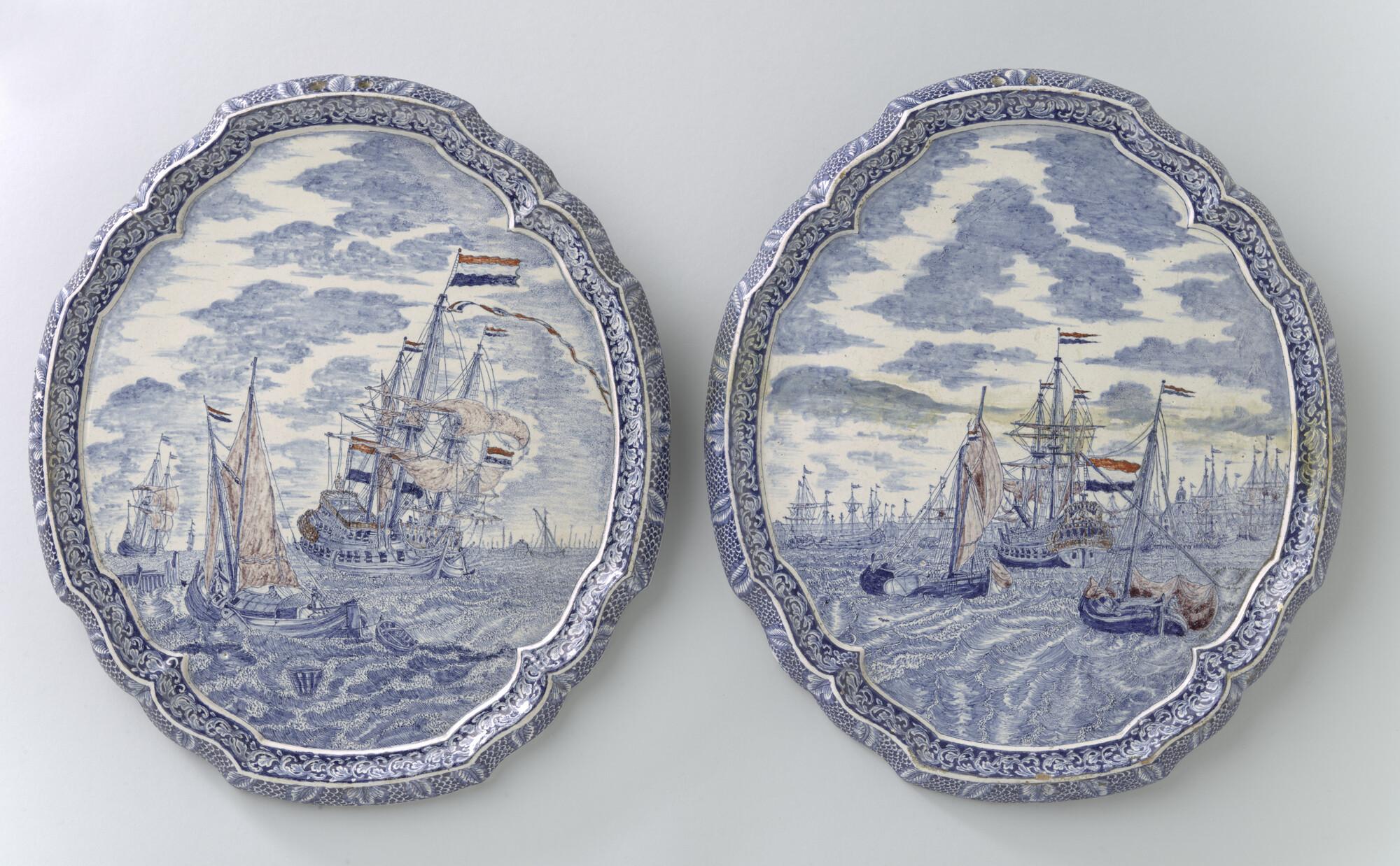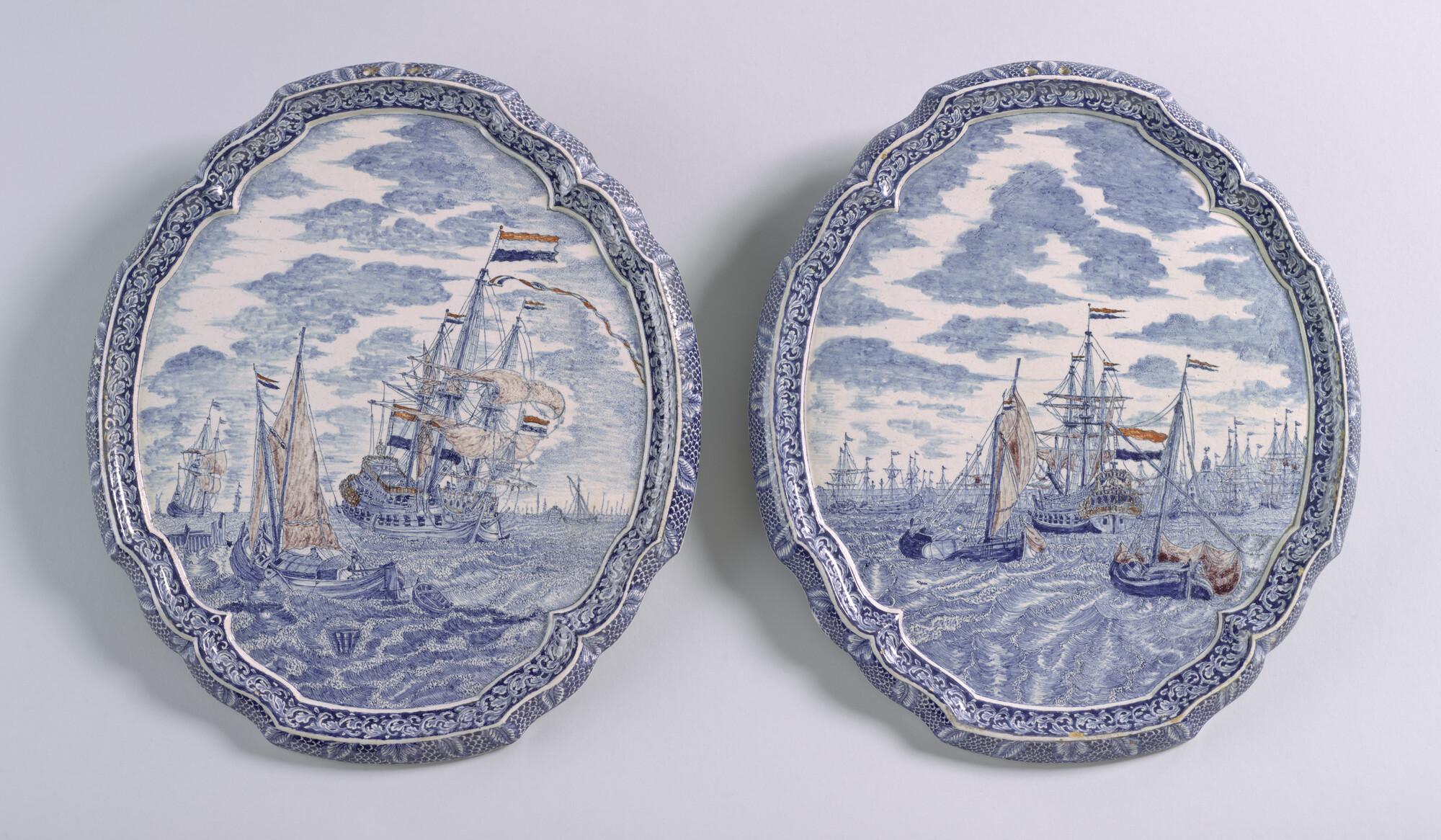 Plaque van Delfts aardewerk met een gezicht op het IJ te Amsterdam, naar het Oosten gezien. Op de voorgrond is een binnenvaarder te zien, met daarachter een koopvaarder. Vormt samen met S.3078(02) de gravure 'Scheepvaart in het IJ voor Amsterdam' van A. Allard, omstreeks 1720.