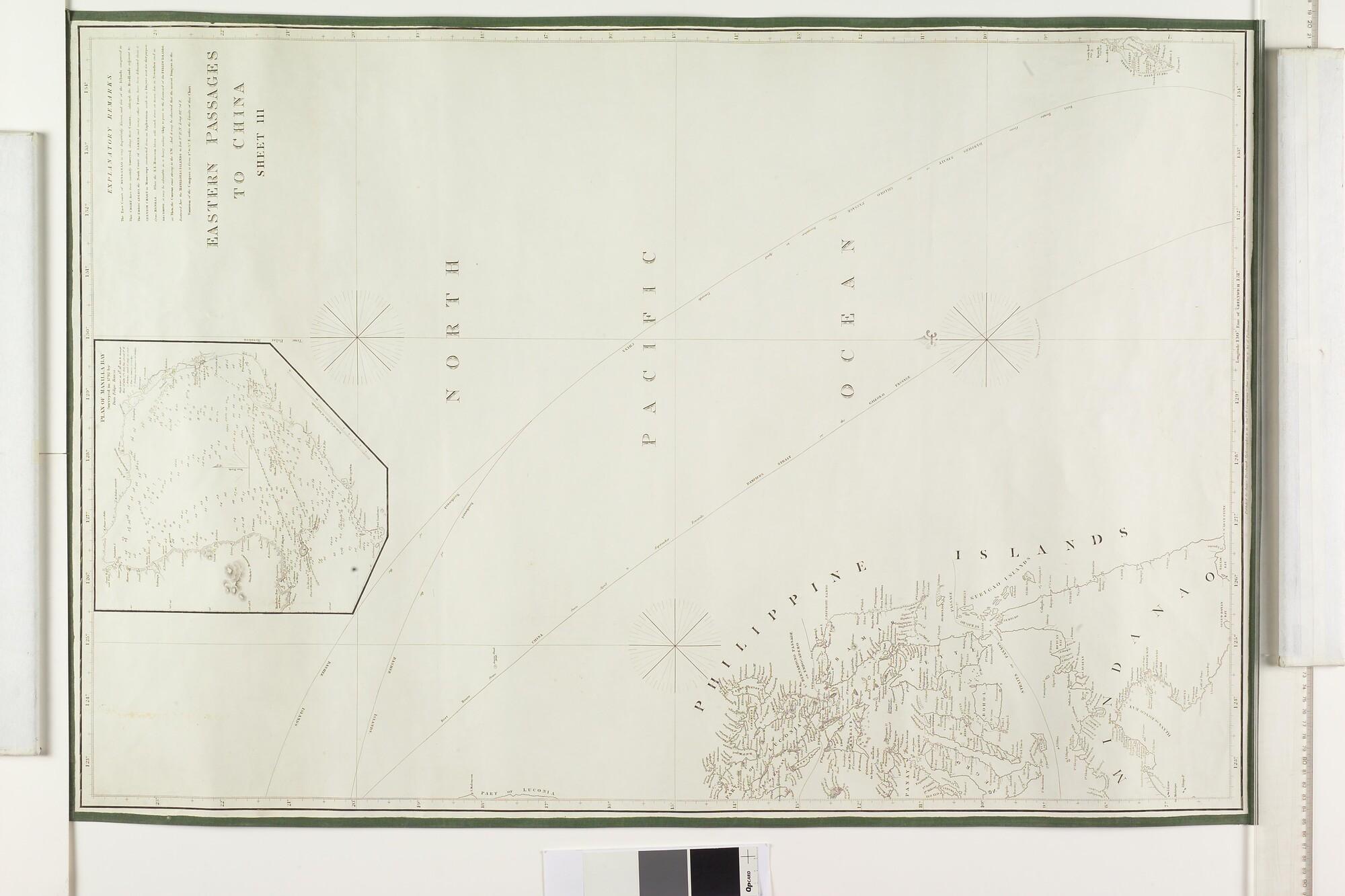 Kaart van de oostelijke passages naar China, in 3 bladen, blad 3, door James Horsburgh (1762 - 1836), gravure Bateman & Son, Londen, 1828. Lengte volgens de meridiaan van Greenwich. Met detailkaart van de baai van Manilla door Don Felipe Bauza, 1792 (schaal 1 op 2.000.000).