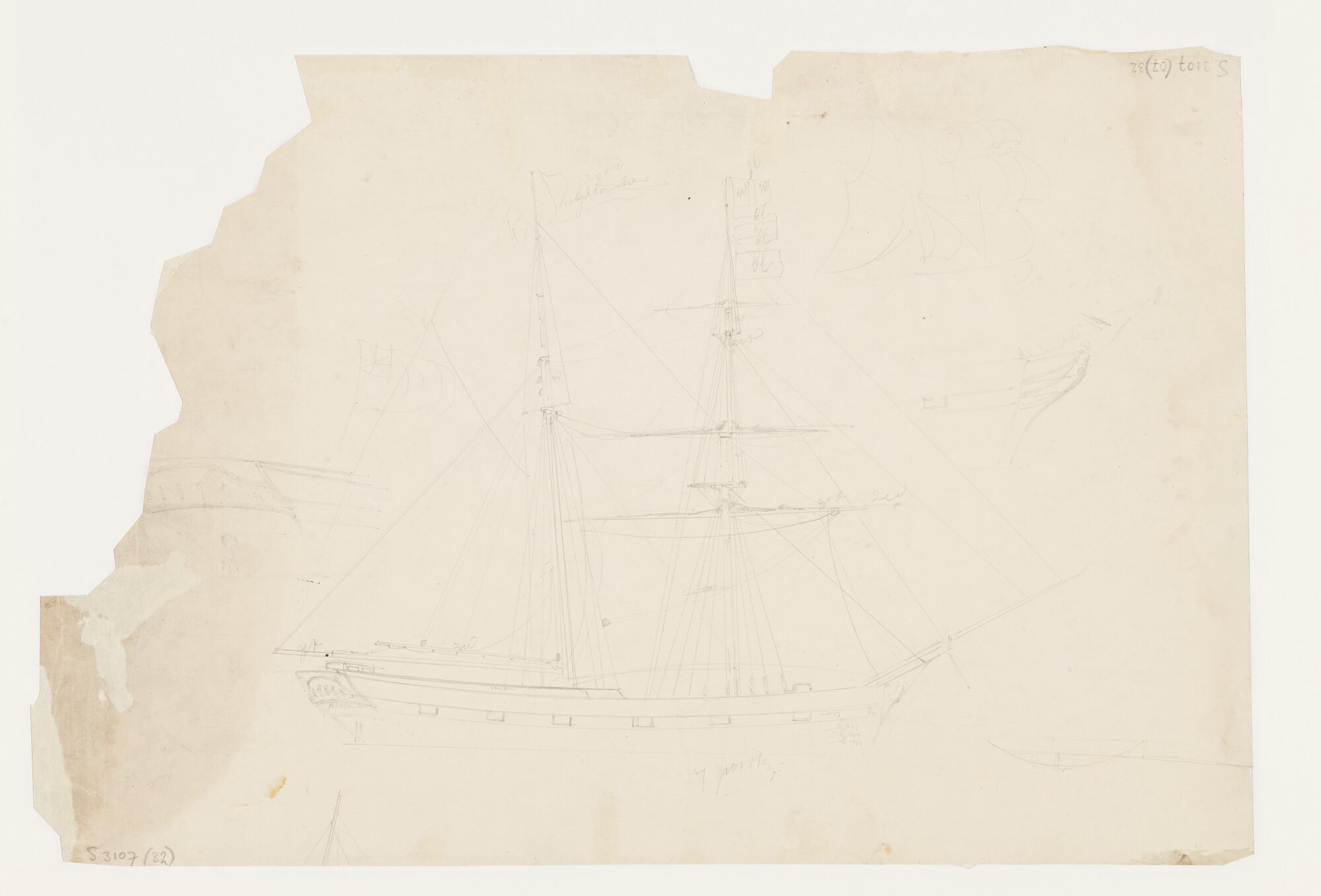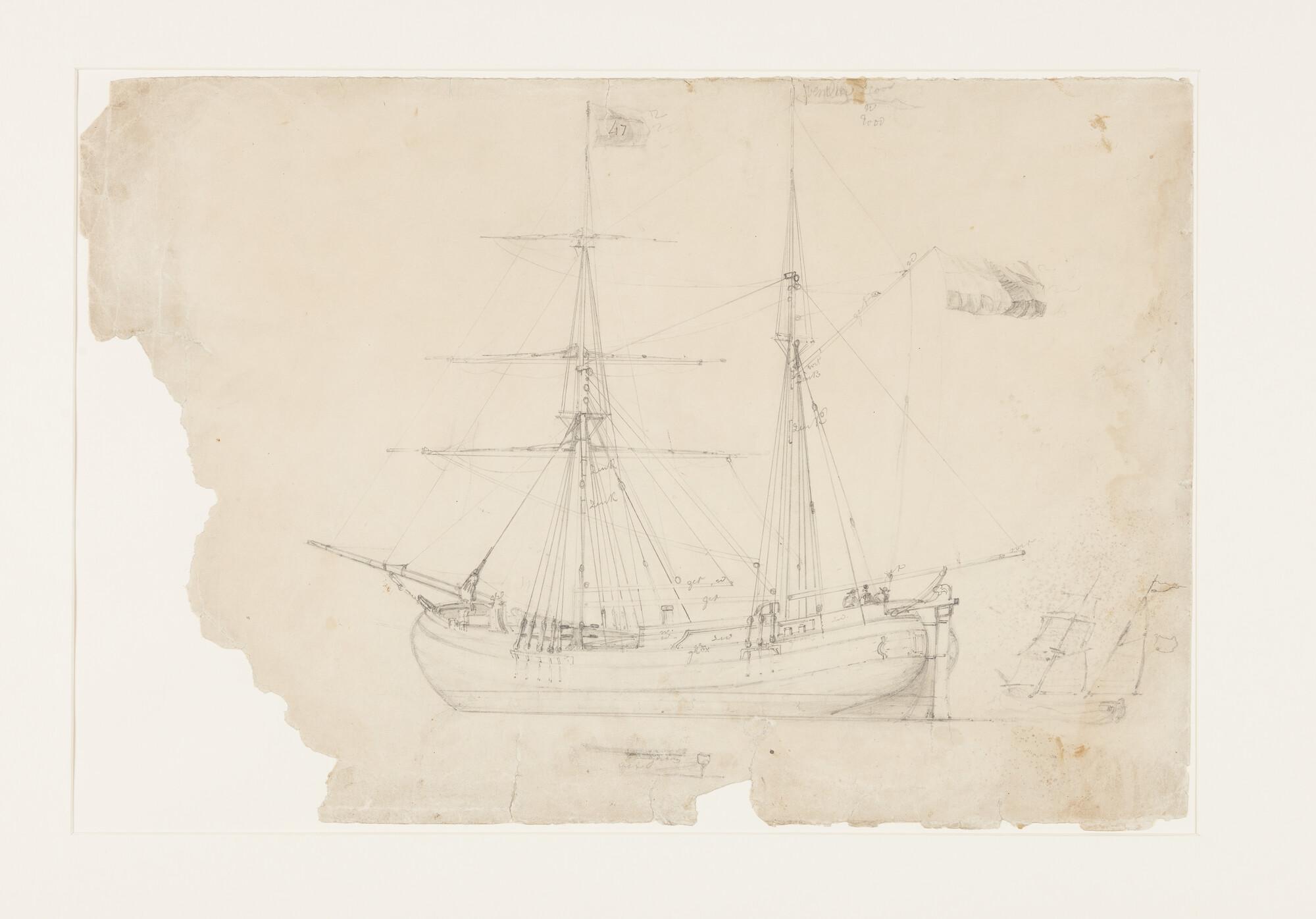 Een kofschip. Verso het Engelse brikschip Highlander (?).