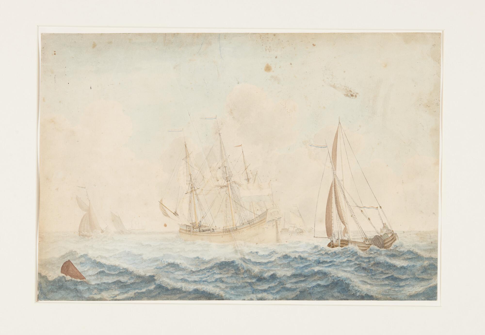 Scheepvaart op ruim water; in het midden een bootschip, rechts een hektjalk, daartussen een spiegeljacht.