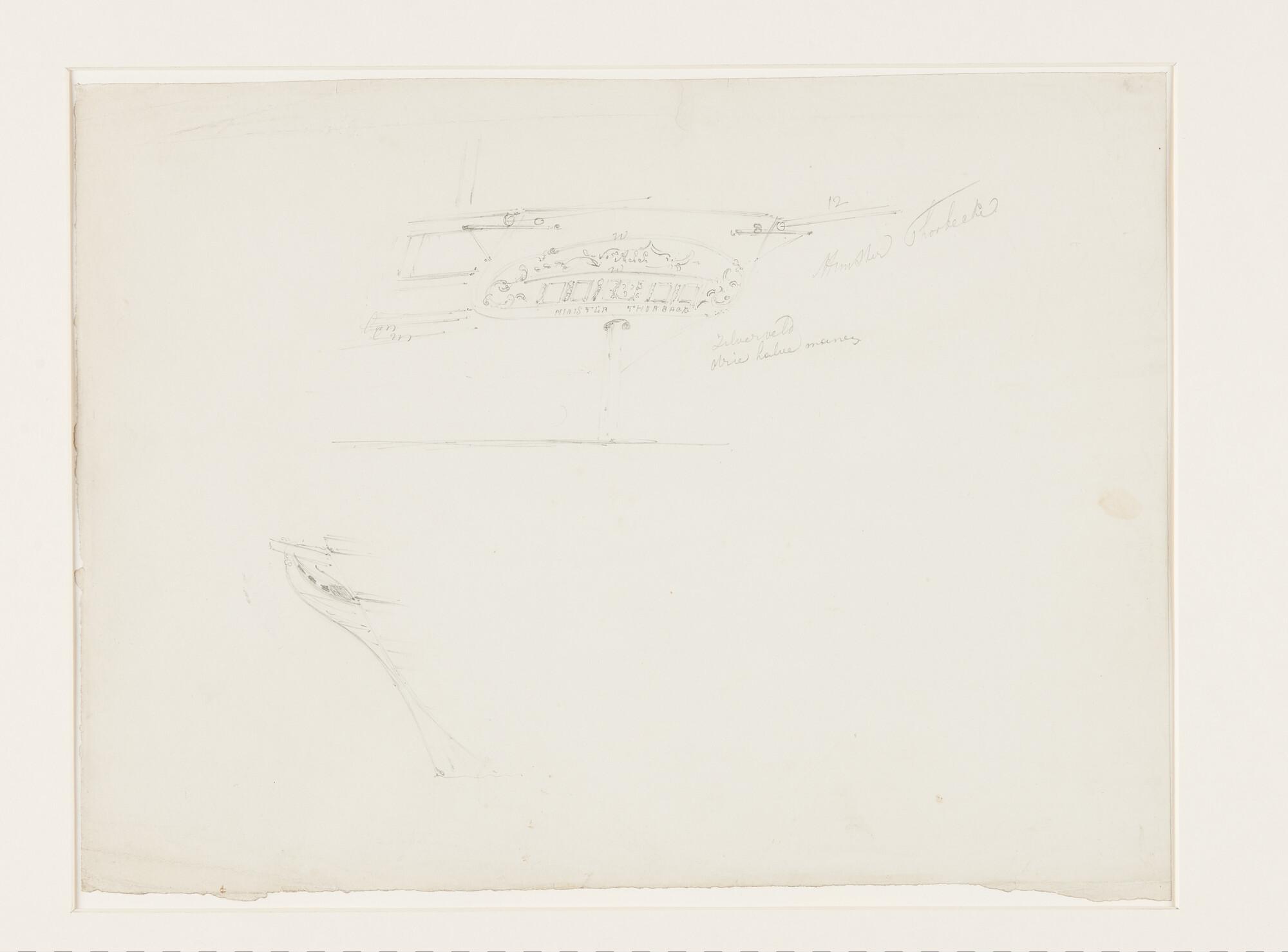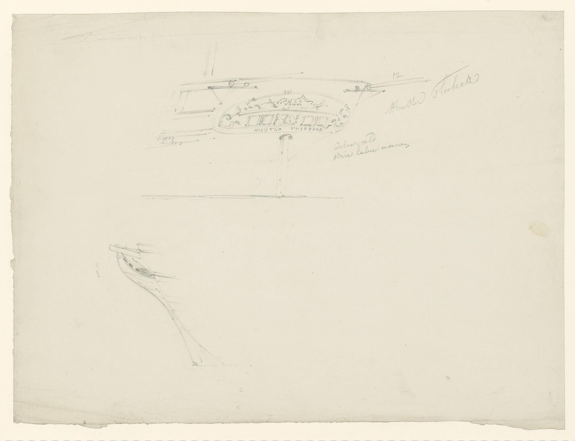 Schets van de spiegel en de voorsteven van het barkschip Minister Thorbecke.