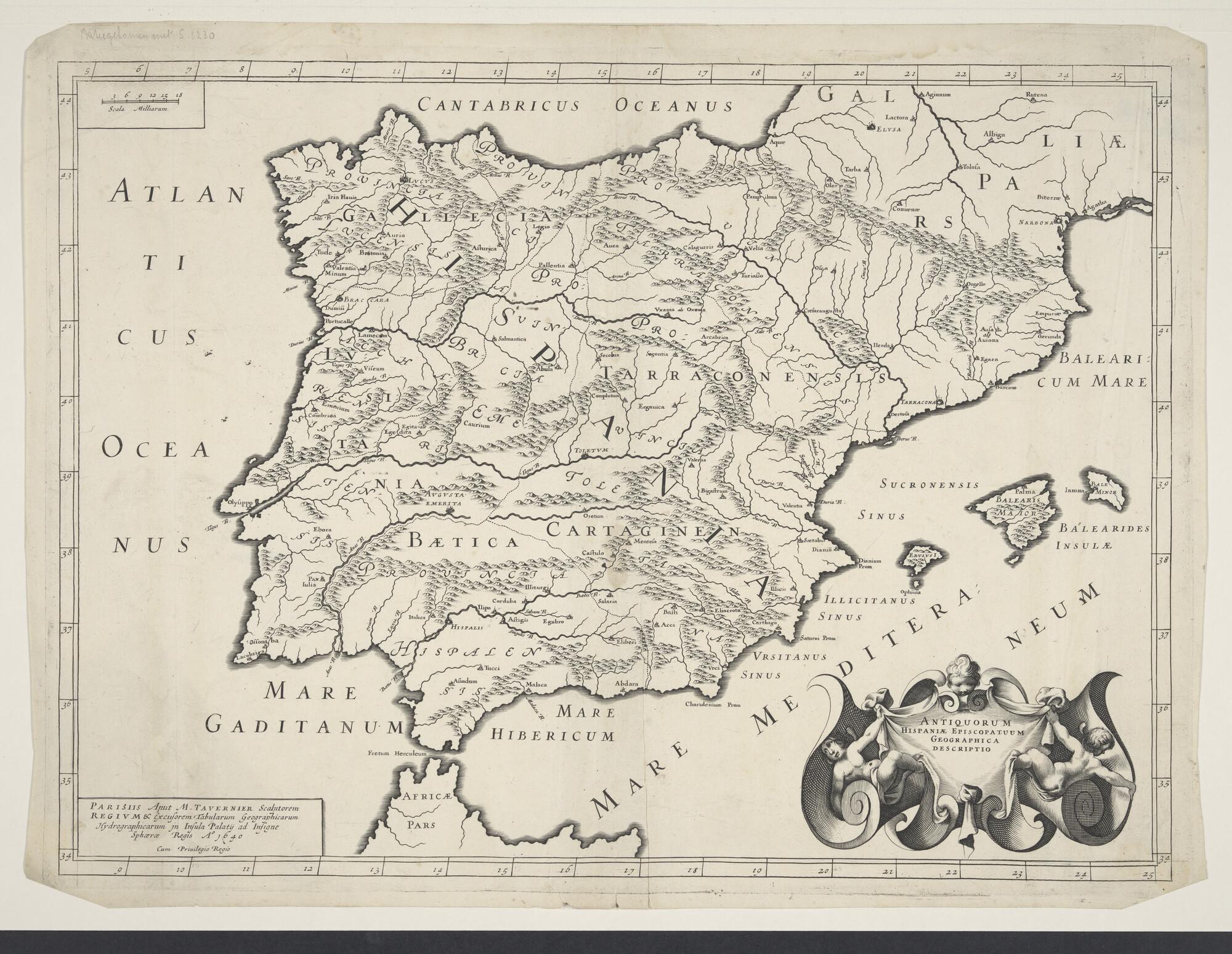 Kaart van het Iberisch schiereiland door Melchior Tavernier (Antwerpen 1564-1641), Parijs, 1640. Lengte t.o.v. de meridiaan van Tenerife (schaal 1 op 3.200.000).