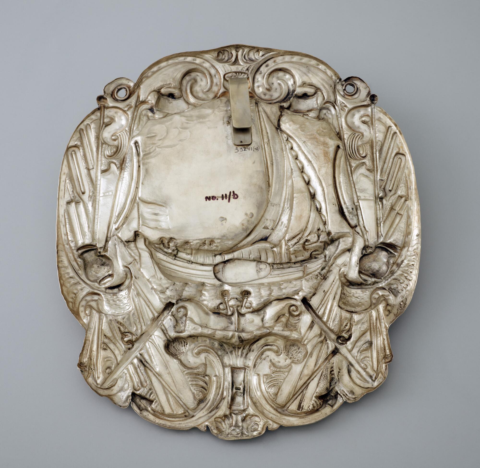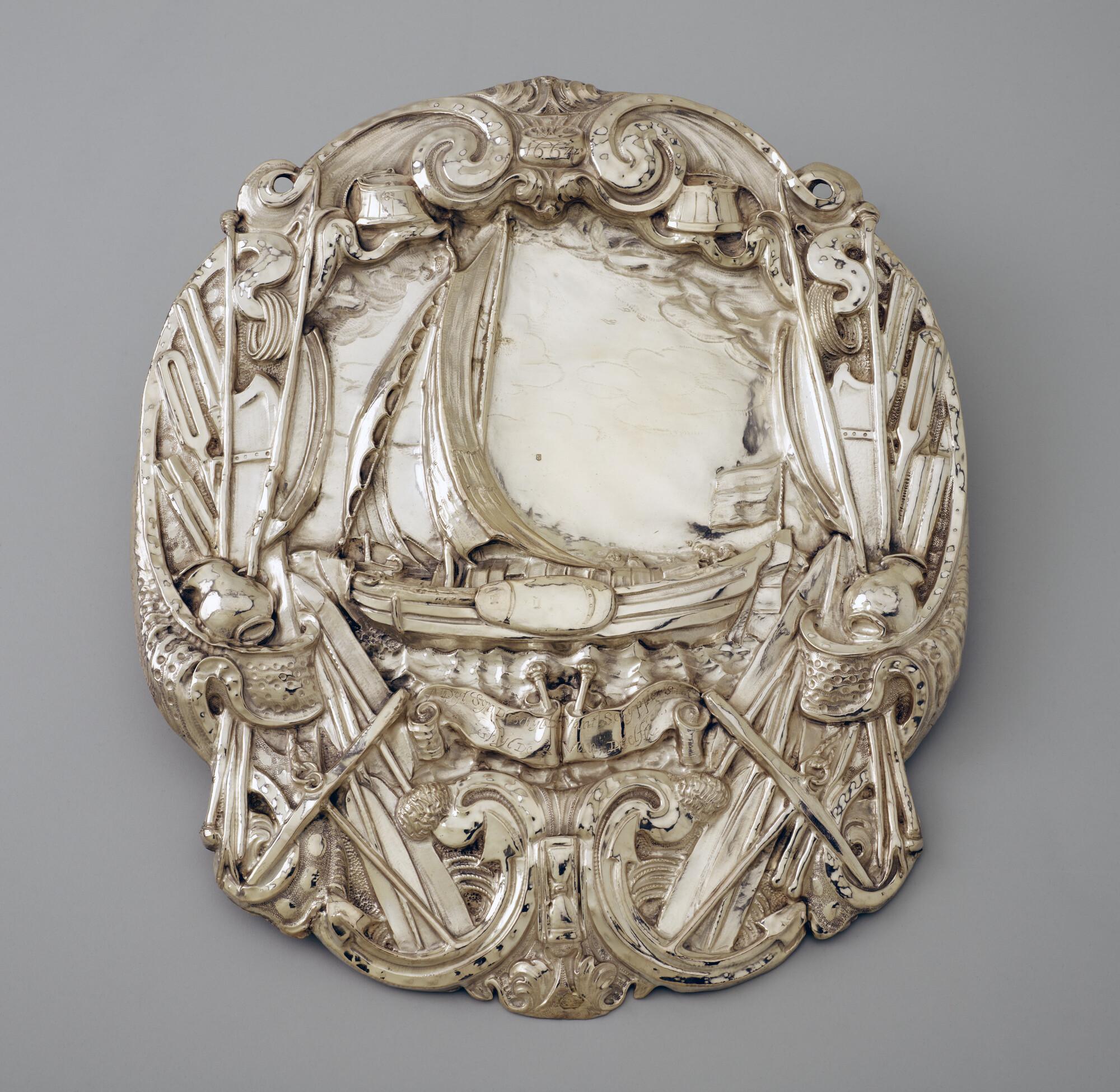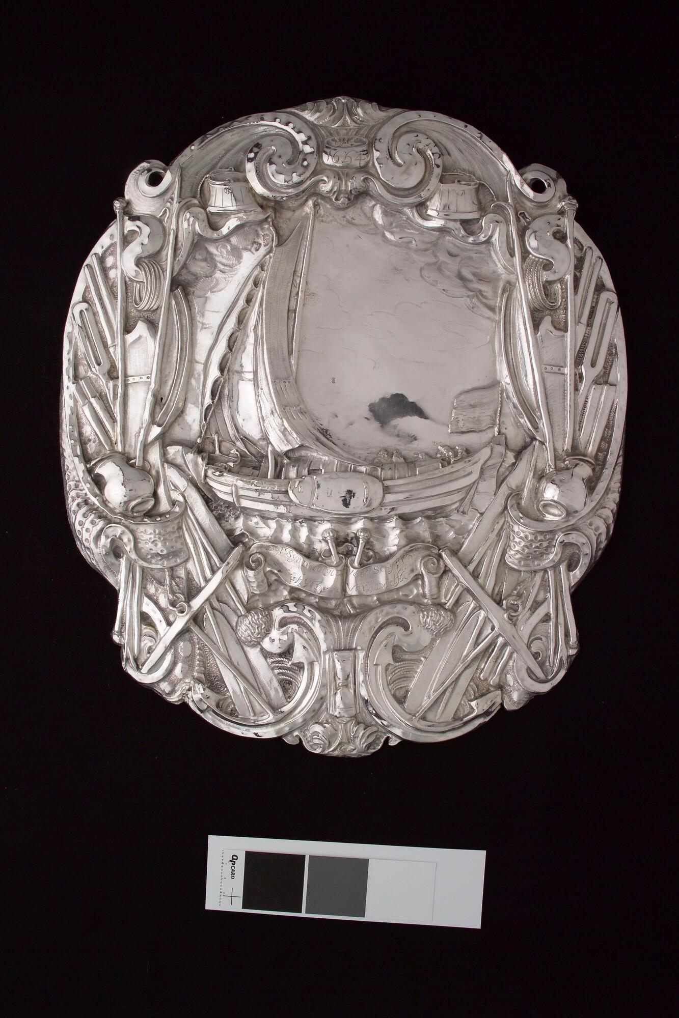 Begrafenisschild van het schippersgilde te Delft. Op het schild een naar links varend veerschip met daaronder een banier met opschrift. Het geheel omgeven door kwabwerk gevuld met ankers, zandlopers, riemen, haken, helmstokken, zwabbers en putsen.
