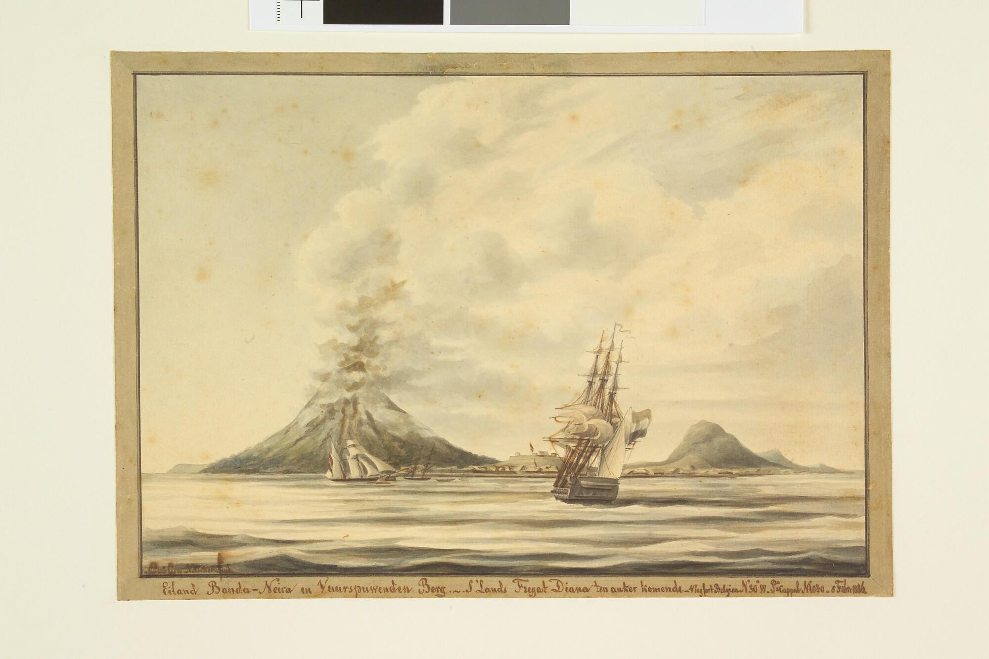 Het fregat "Diana" ankerend bij Bandaneira, eiland in het oosten van de Indische archipel.