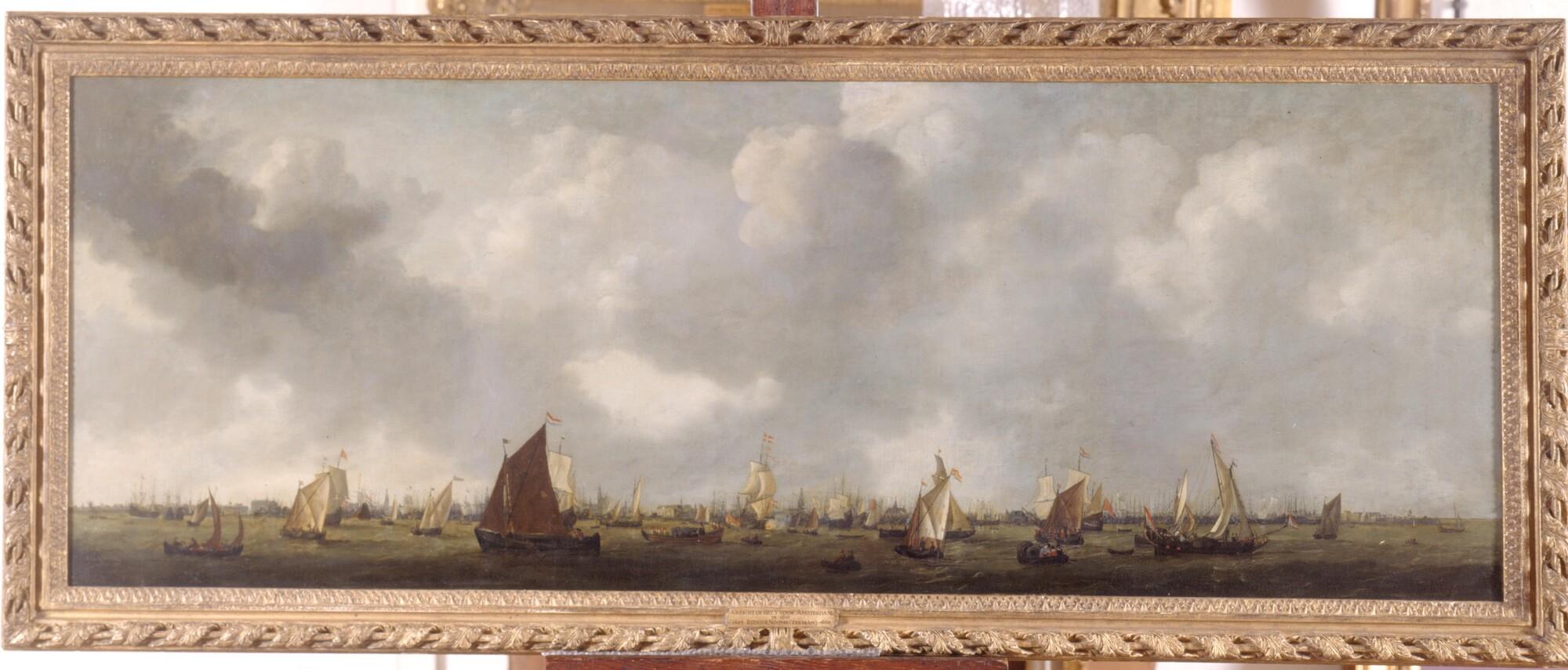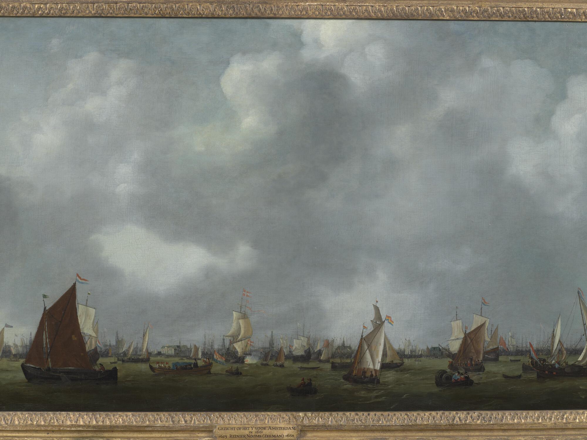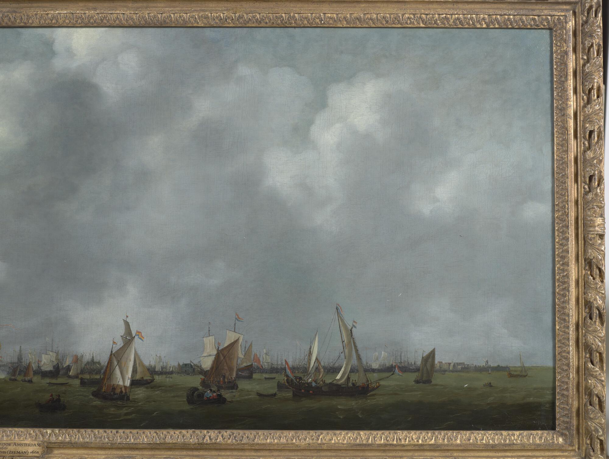 Schilderij in lijst van scheepvaart op het IJ voor Amsterdam.