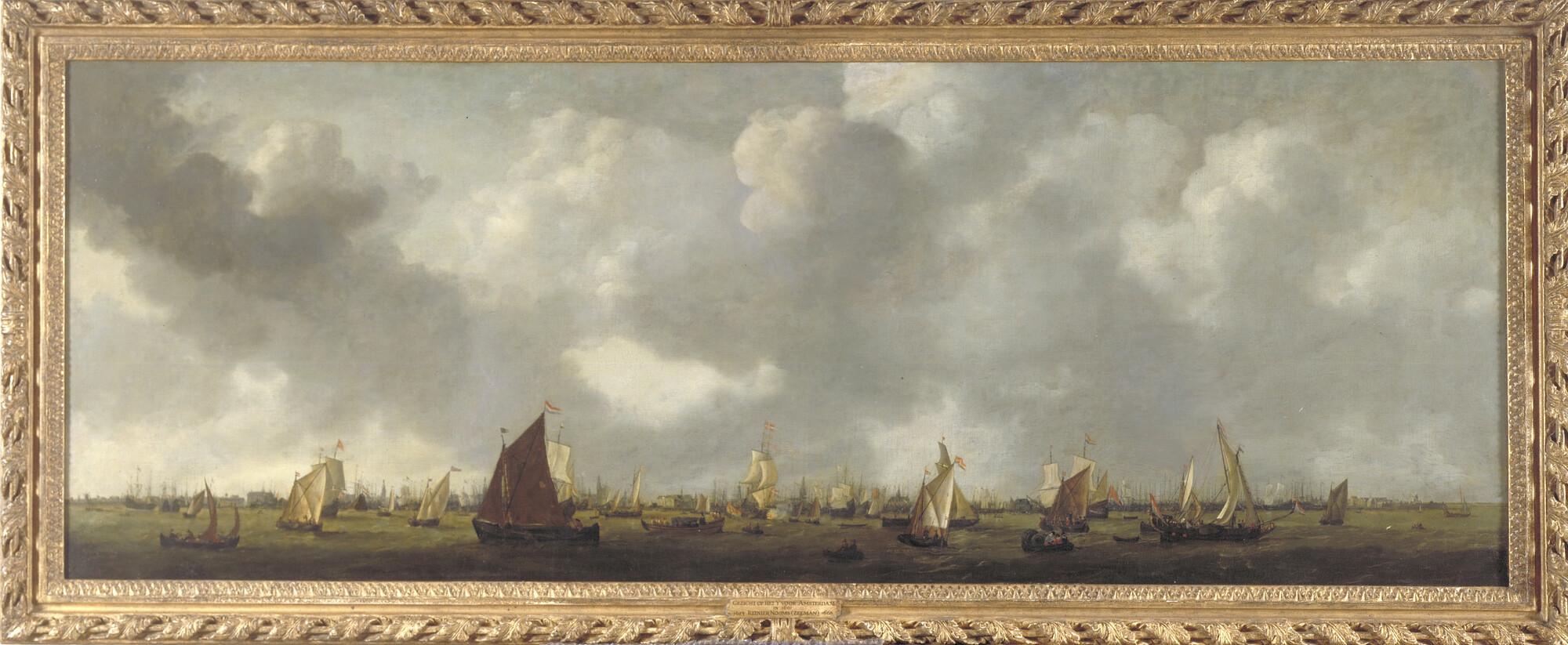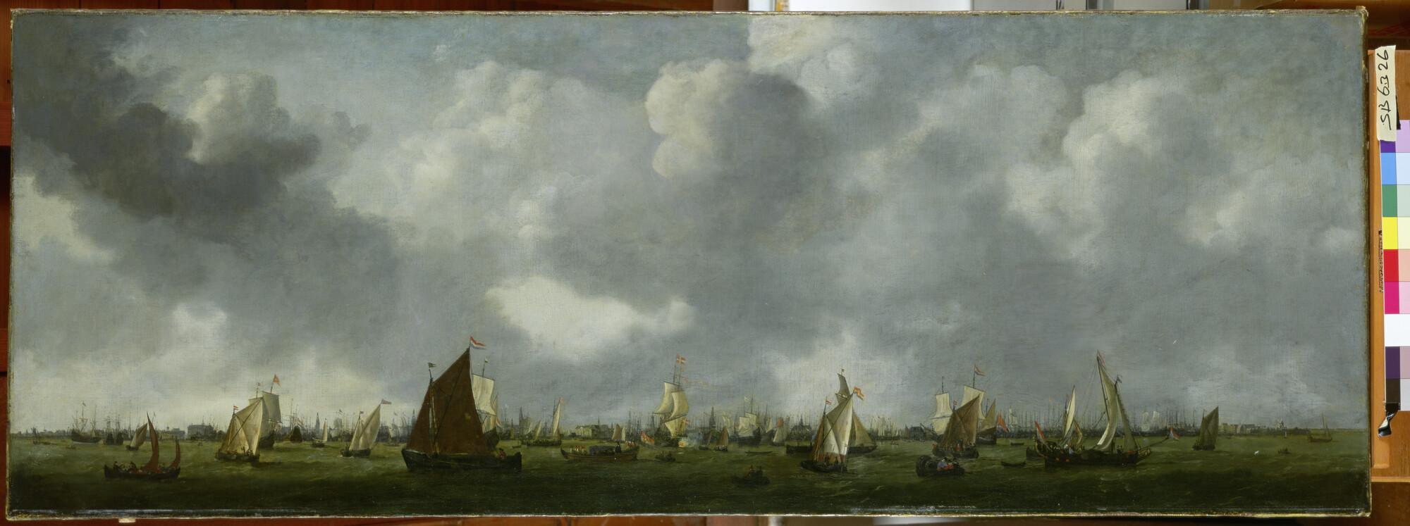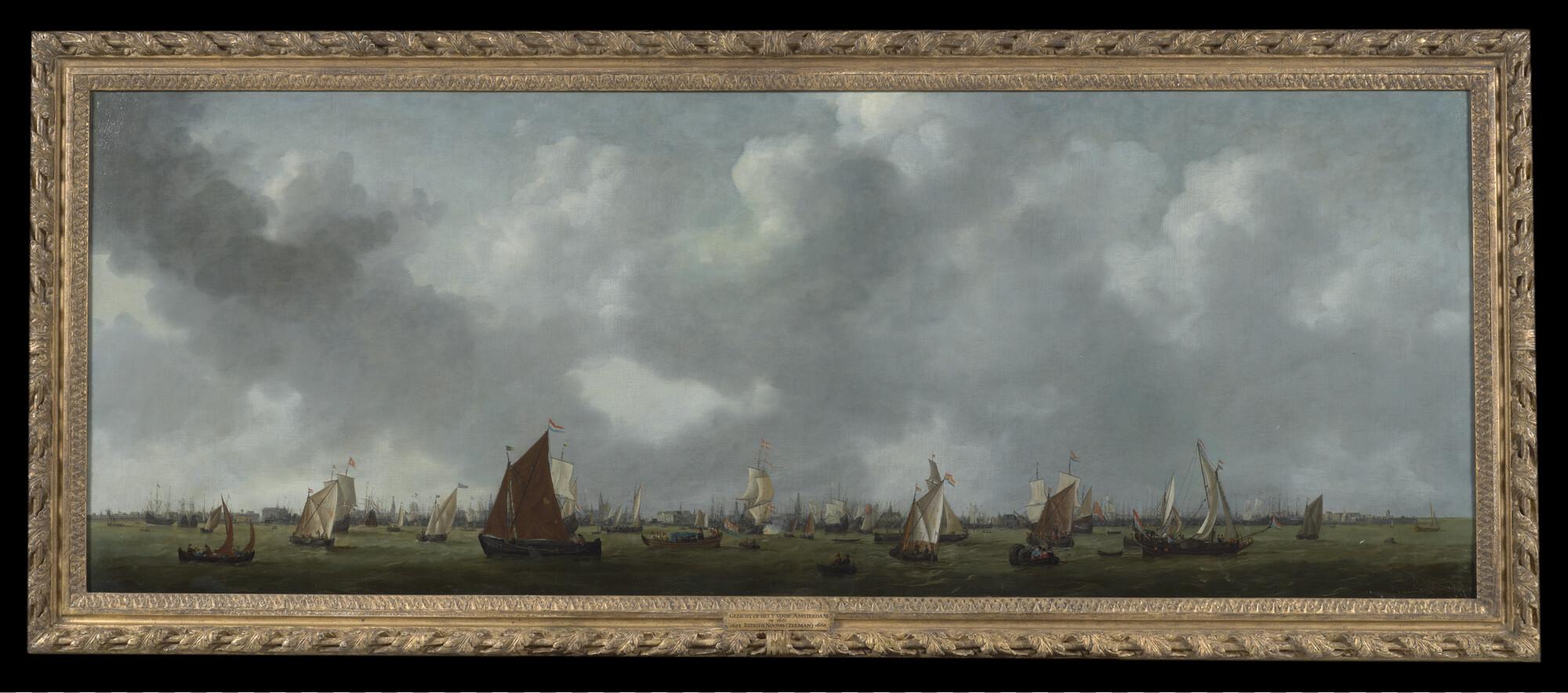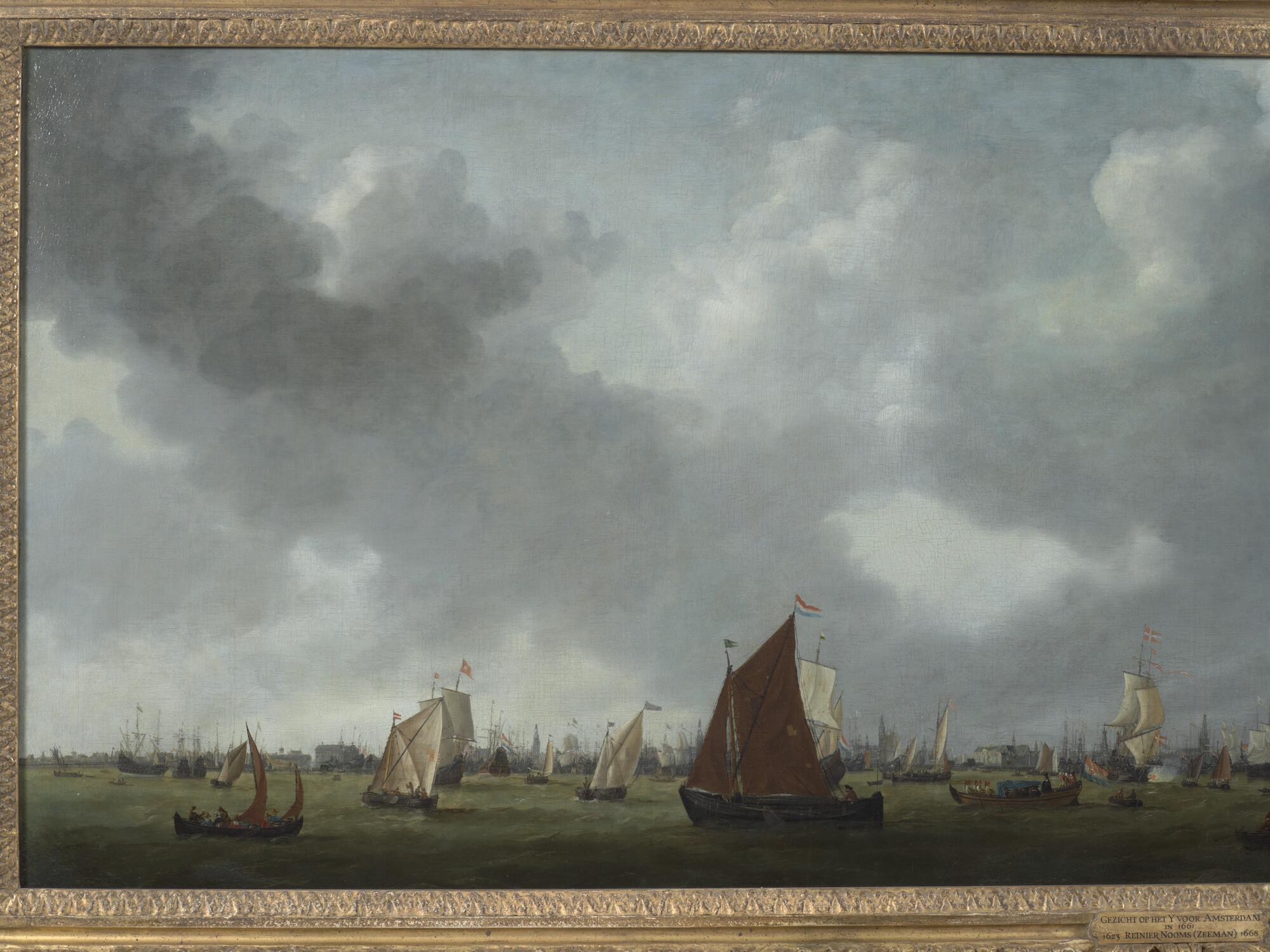 Schilderij in lijst van scheepvaart op het IJ voor Amsterdam.