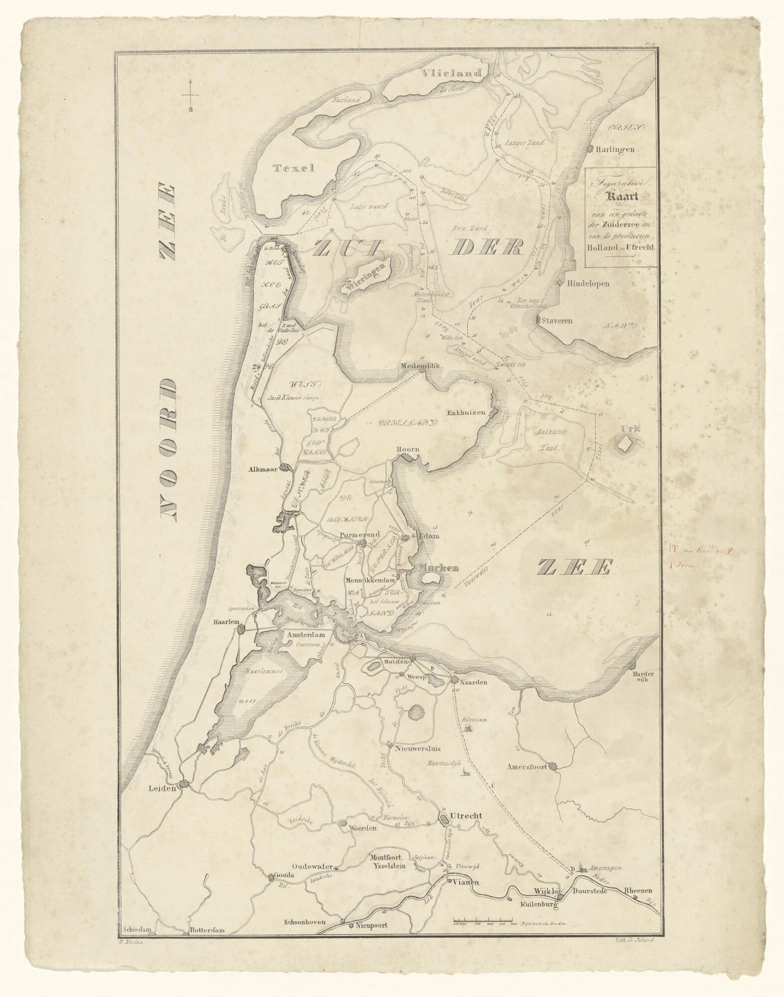 Kaart van een gedeelte van de Zuiderzee, met de verbinding tussen Amsterdam en de Noordzee en de provincies Holland en Utrecht, door H. Kreins, lithografie Ambroise Jobard (werkzaam Amsterdam & Brussel, 1827 - 1830).