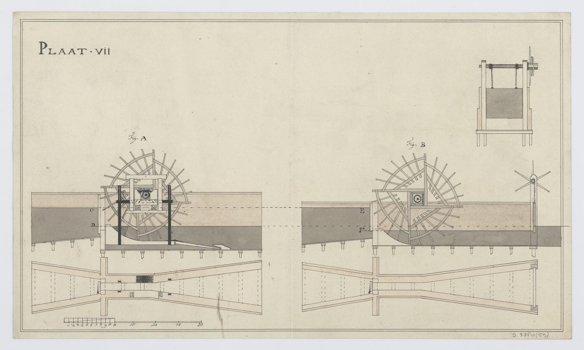 Detail pomp. Constructietekening van een molen voor een prijsvraag voor een wind- en watermolen in 1793.