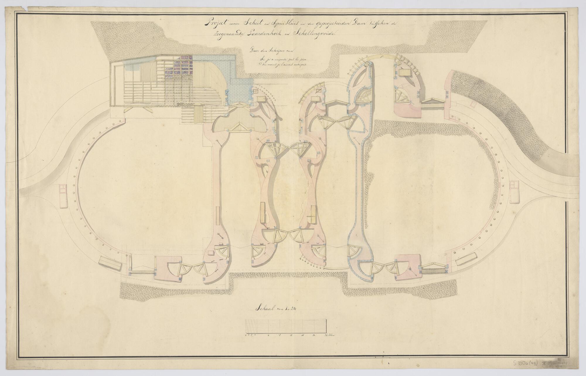Plattegrond van een dam met sluizen tussen de Paardenhoek en Schellingwoude. Tekening horende bij een prijsvraag in 1823 voor afsluiting van het IJ. Hoort bij onbekroond antwoord E (schaal 1:250).