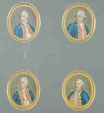 Vier miniaturen met portretjes van vier marine-officieren betrokken bij de Slag op de Doggersbank, in één lijst. Van linksboven naar rechtsonder; kapitein-ter-zee Willem van Braam, Wolter Jan Gerrit baron Bentinck, Jan Hendrik van Kinsbergen en schout-bij-nacht Johan Arnold Zoutman.