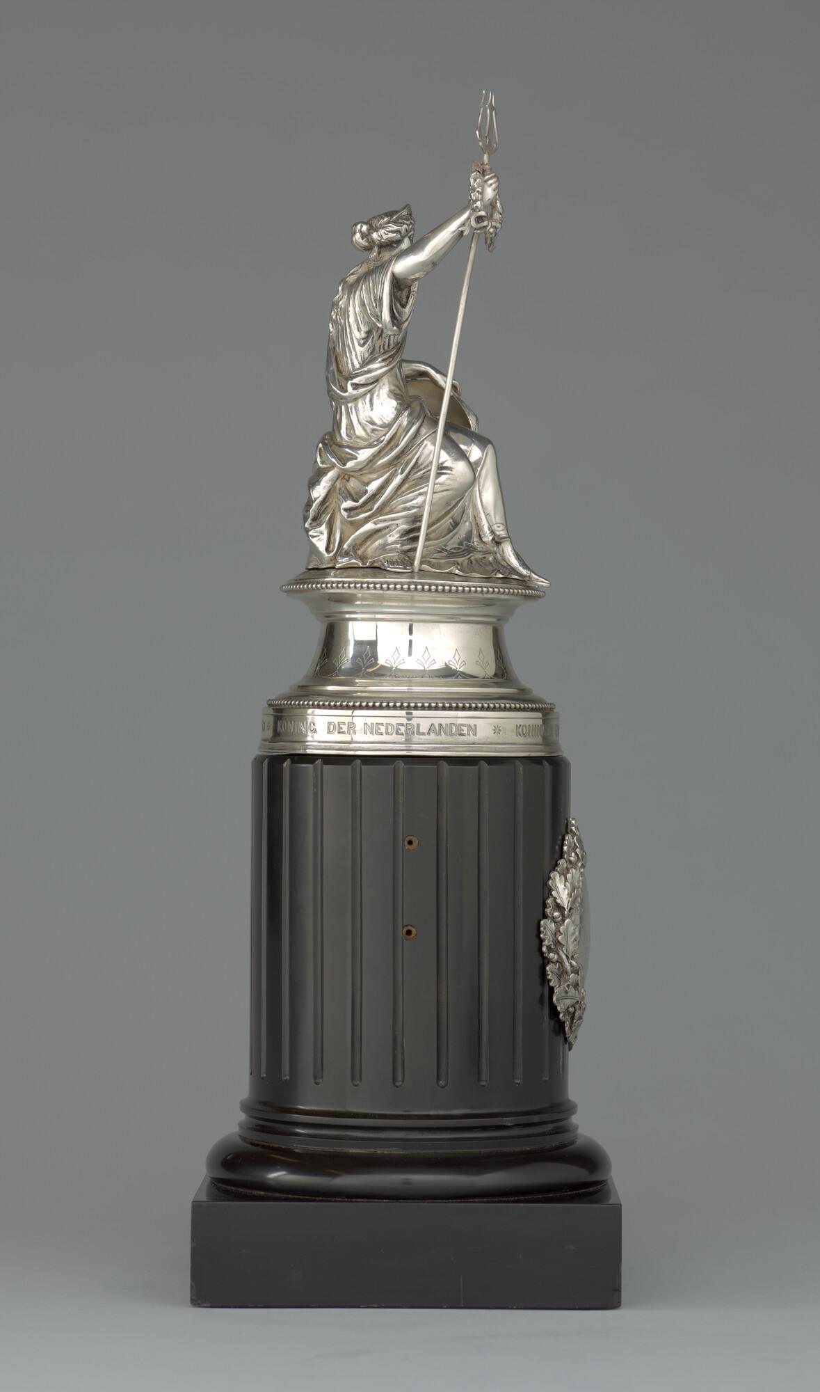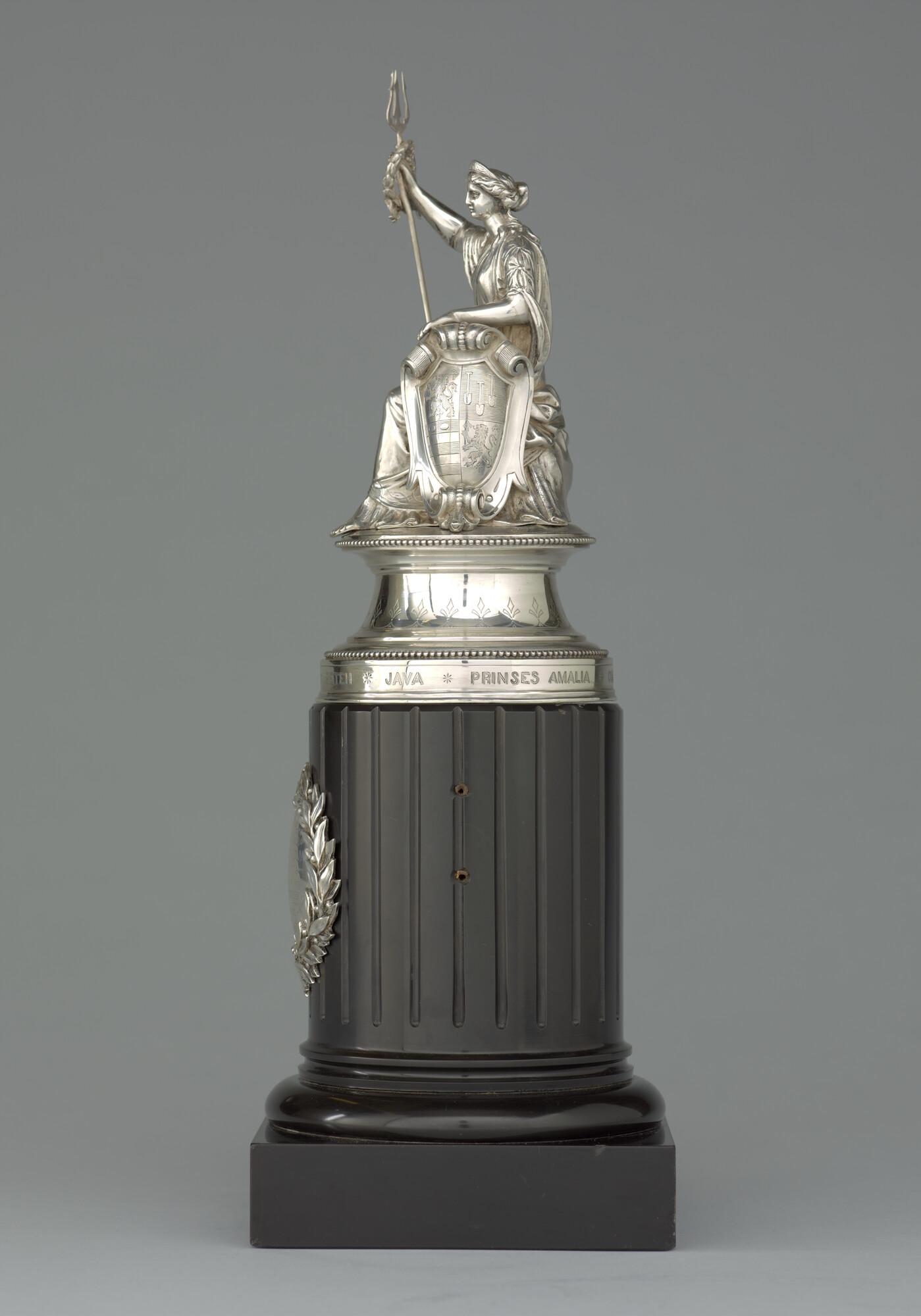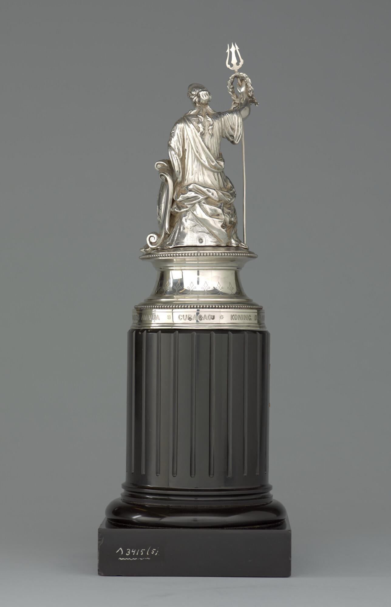 Zilveren beeld van een allegorische vrouwenfiguur met een wapenschild en een drietand met lauwerkrans. Op wapenschild het wapen van de familie van Rensselaer Bowier. Het beeld is geplaatst op een stenen sokkel met daarop een zilveren plaquette.