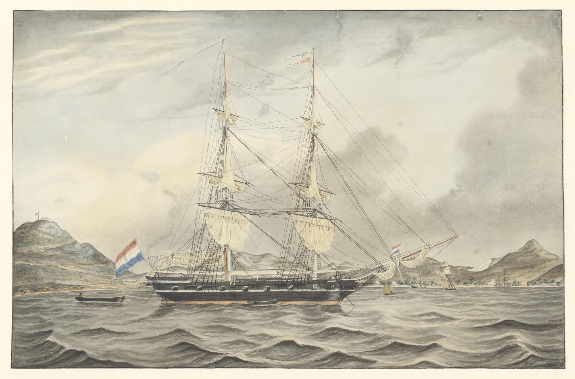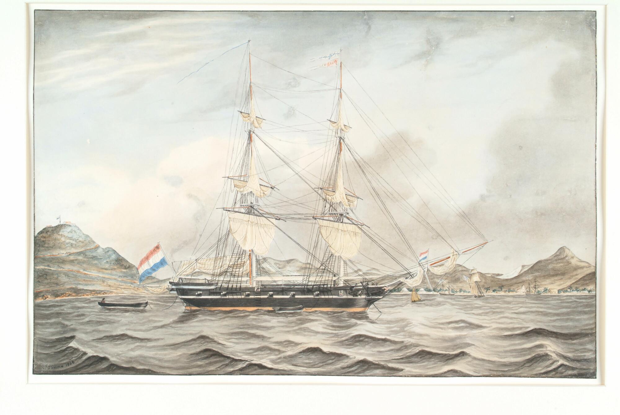 De brik Zr.Ms. Arend, onder bevel van kapitein-luitenant-ter-zee P. Sauvage op de rede van Sint Maarten.