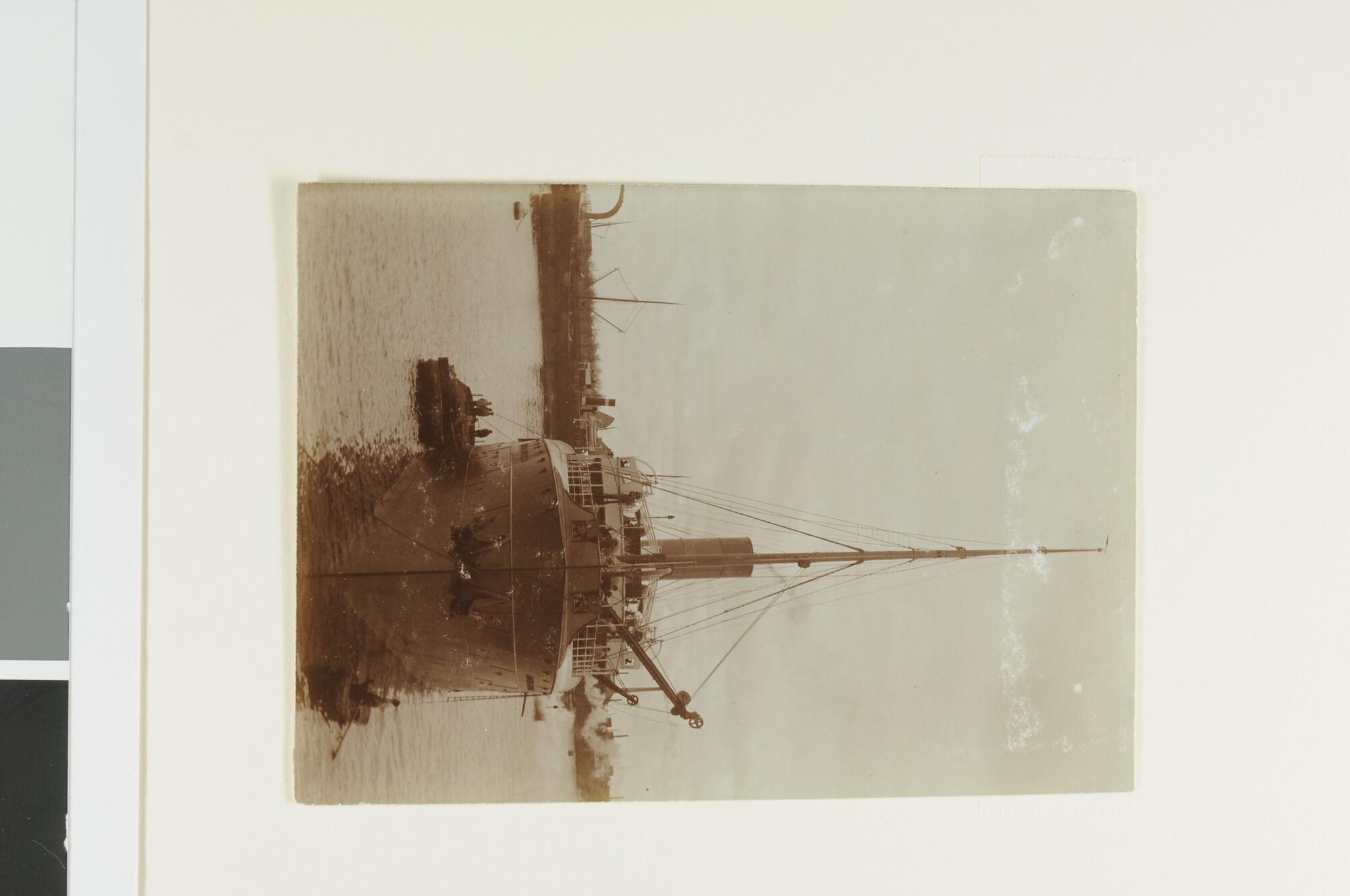 Het mailschip ss. Koning Willem I van de Stoomvaart-Maatschappij Nederland (SMN) afgemeerd op het IJ te Amsterdam, vooraanzicht.