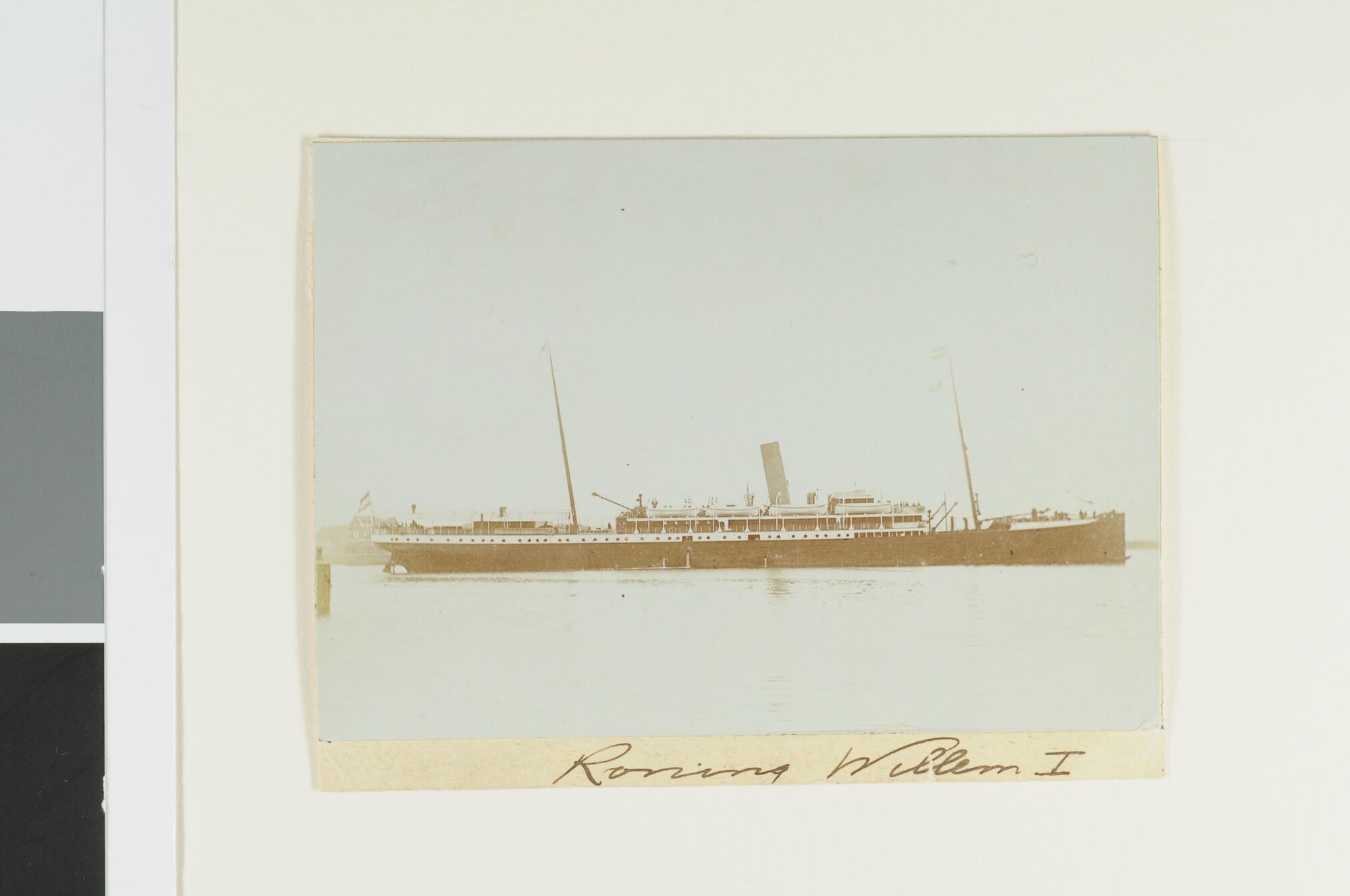 Het mailschip ss. Koning Willem I van de Stoomvaart-Maatschappij Nederland (SMN) bij IJmuiden, stuurboordaanzicht.
