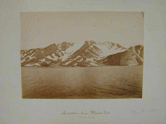 Map met een verzameling losse foto's gedeeltelijk met onderschrift van de zevende Noordpoolexpeditie van de Willem Barents in 1884