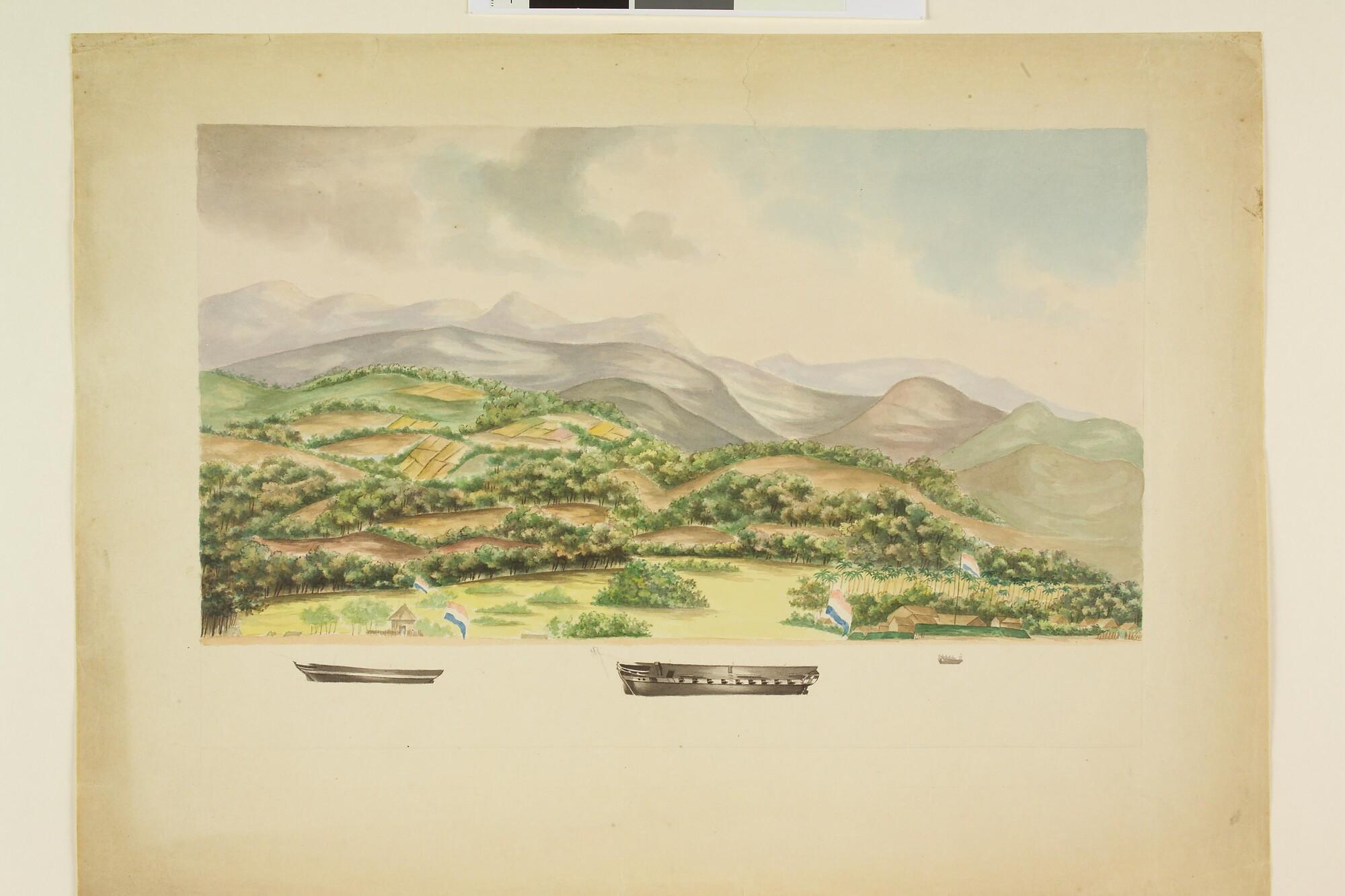 Een onbekende baai in Oost-Indië; aan het strand drie gebouwen en vier Nederlandse vlaggen; op de voorgrond twee rompen van schepen en een sloep. Onvoltooide tekening