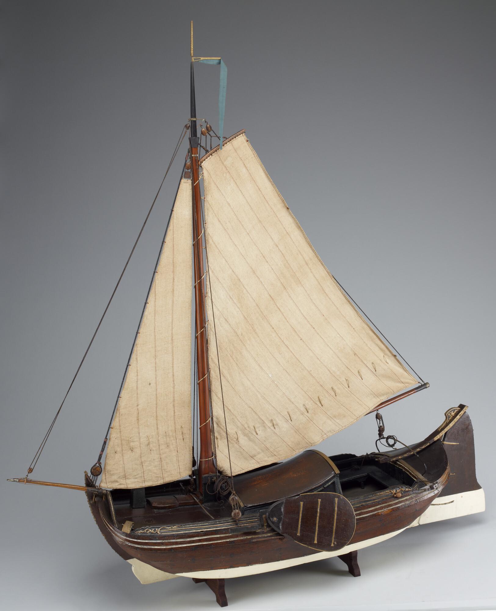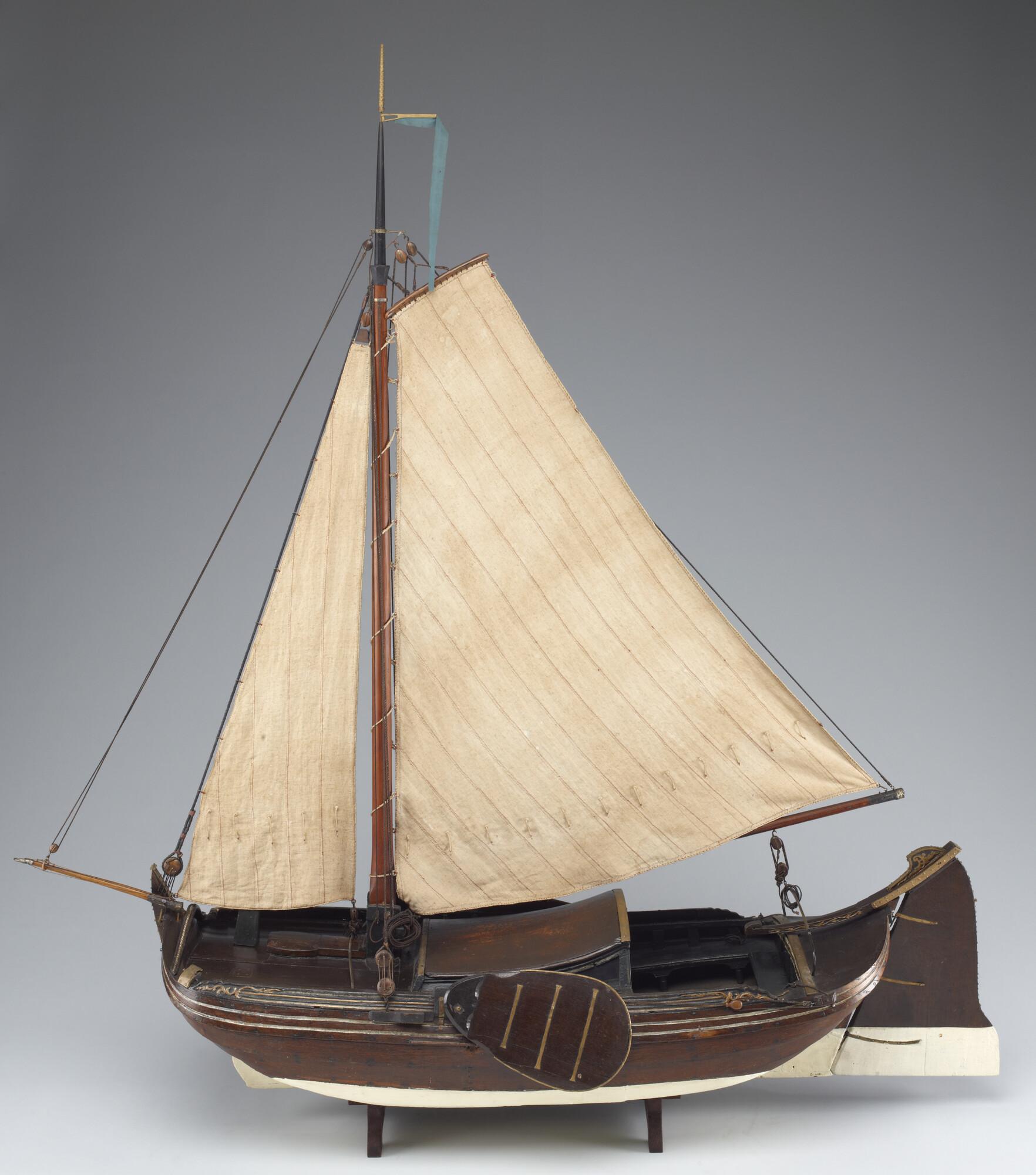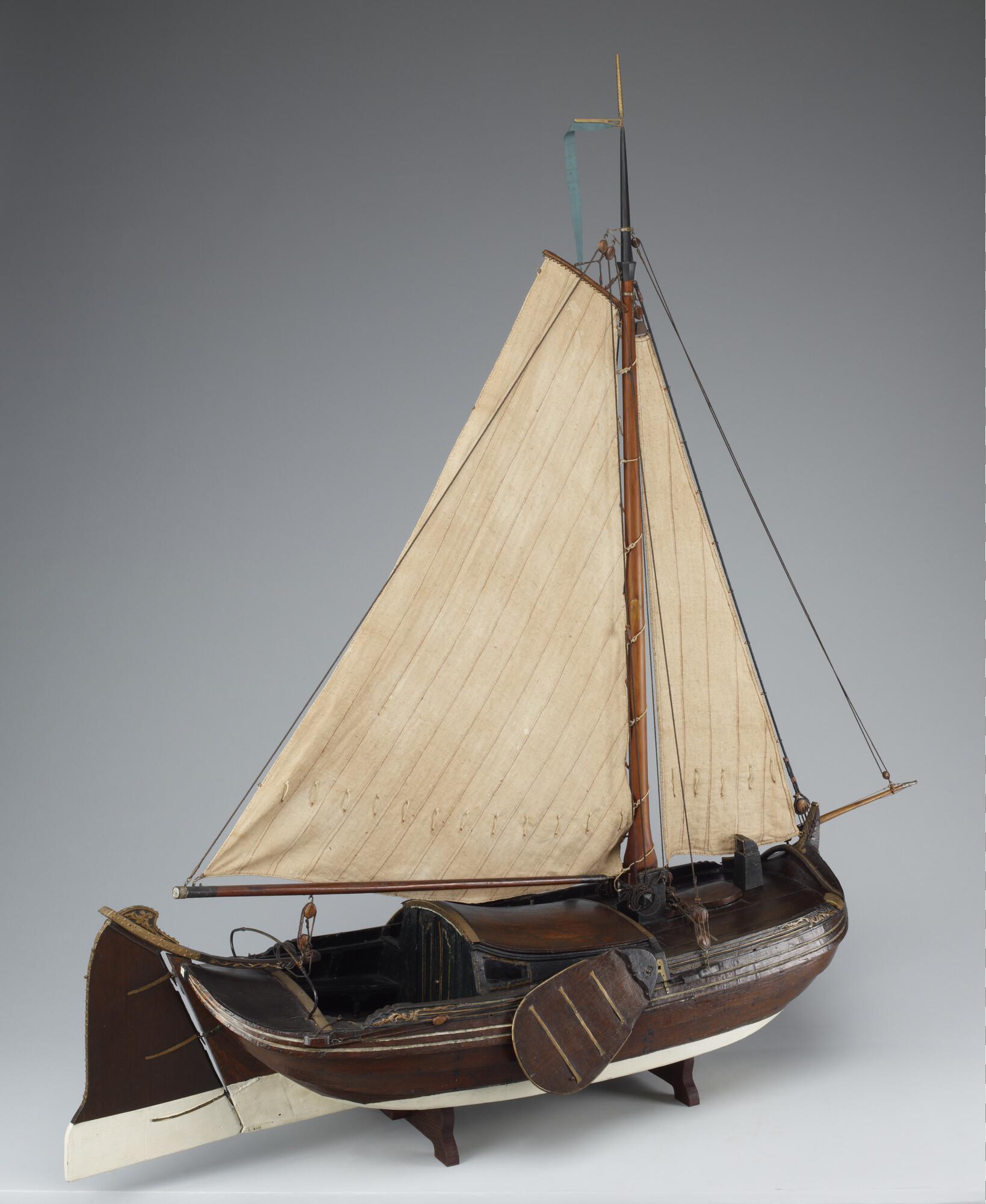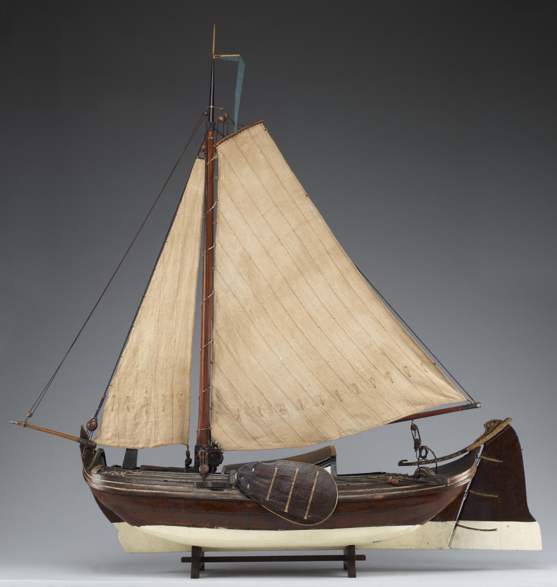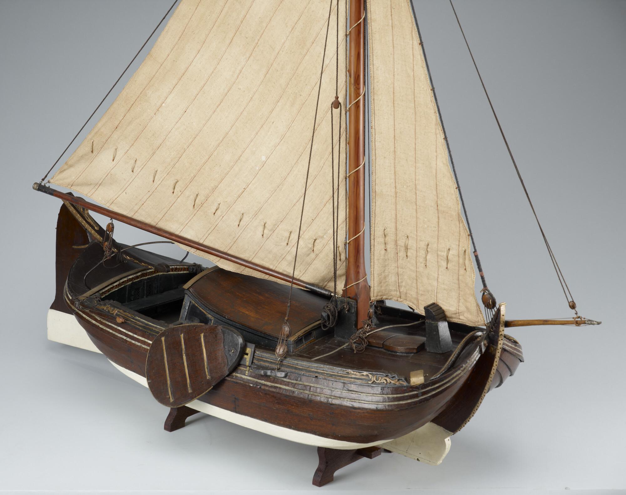 Getuigd model van een Leidse boeier, 1774, vermoedelijk het stadsjacht van Leiden. Op de hennebalk is de naam van de maker ingesneden. De drie gangen in het vlak zijn karveel. Daarop sluit de kimgang aan die in de boegen overnaads is en midscheeps karveel is. Hierboven zijn weer drie gangen, en daarboven het boeisel. De ...