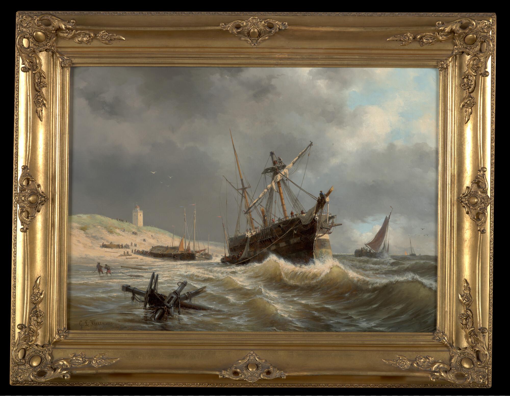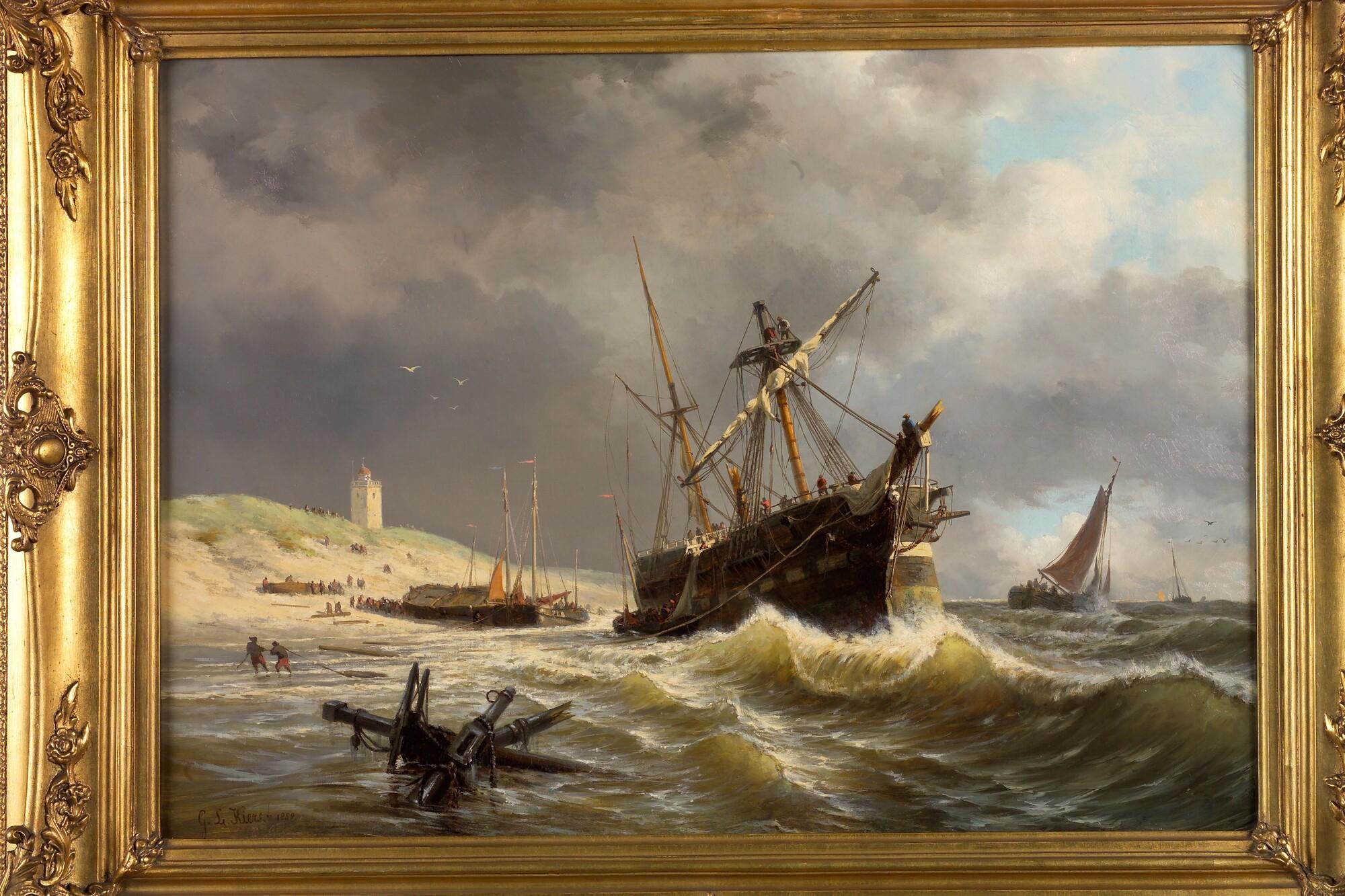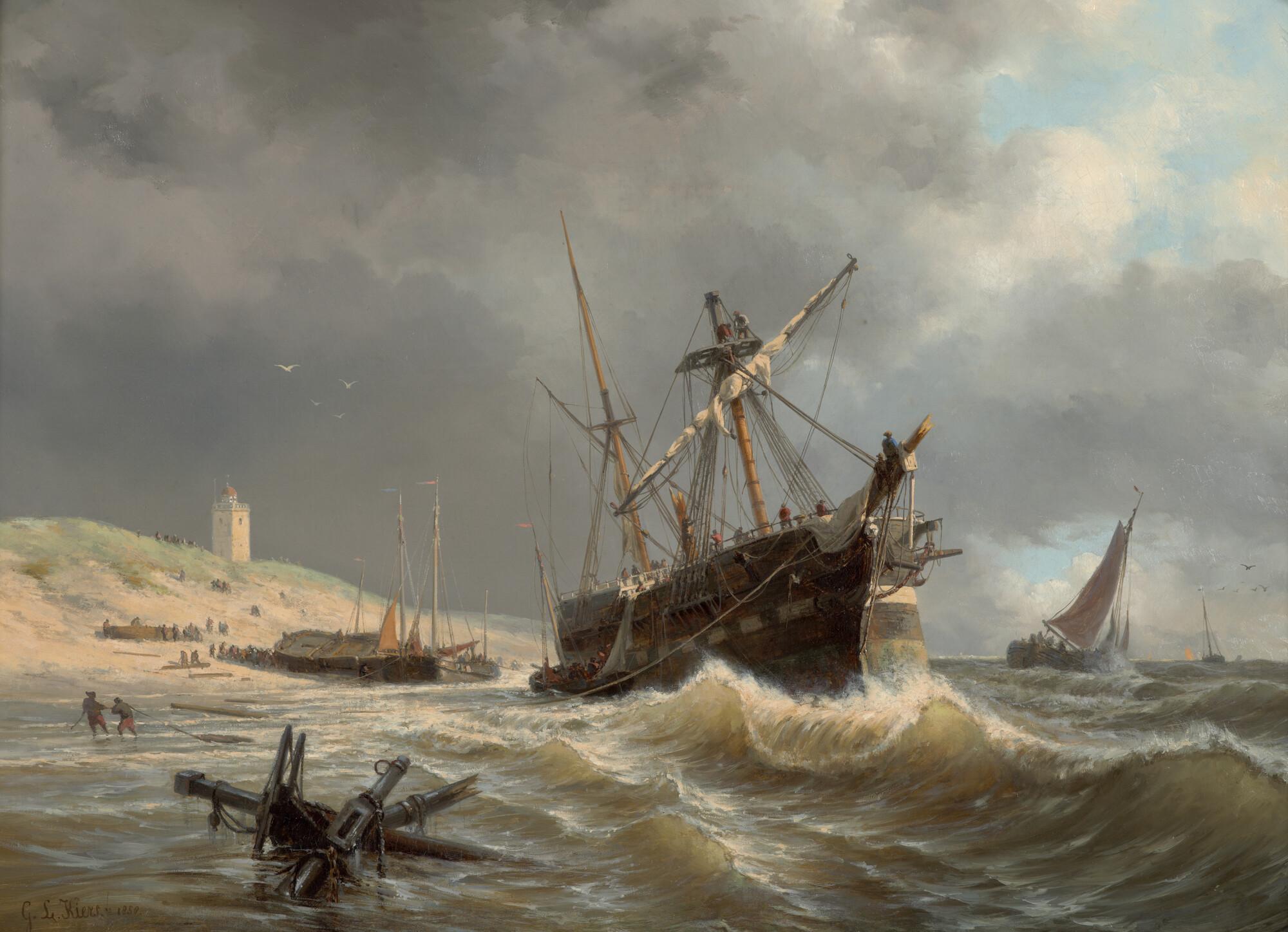 Een gestrand barkschip, op de achtergrond de oude vuurbaak van Katwijk en enige bomschuiten.