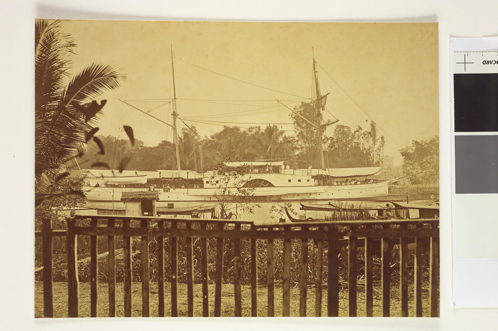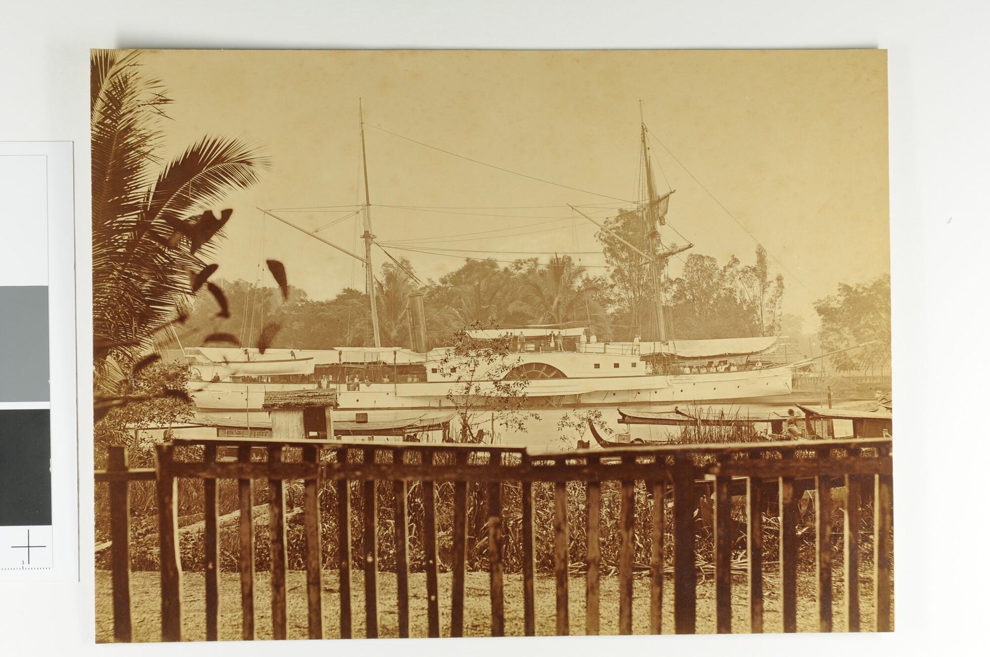 Vermoedelijk het raderstoomschip 4e klasse Hr.Ms. Sindoro in de Indische Archipel.