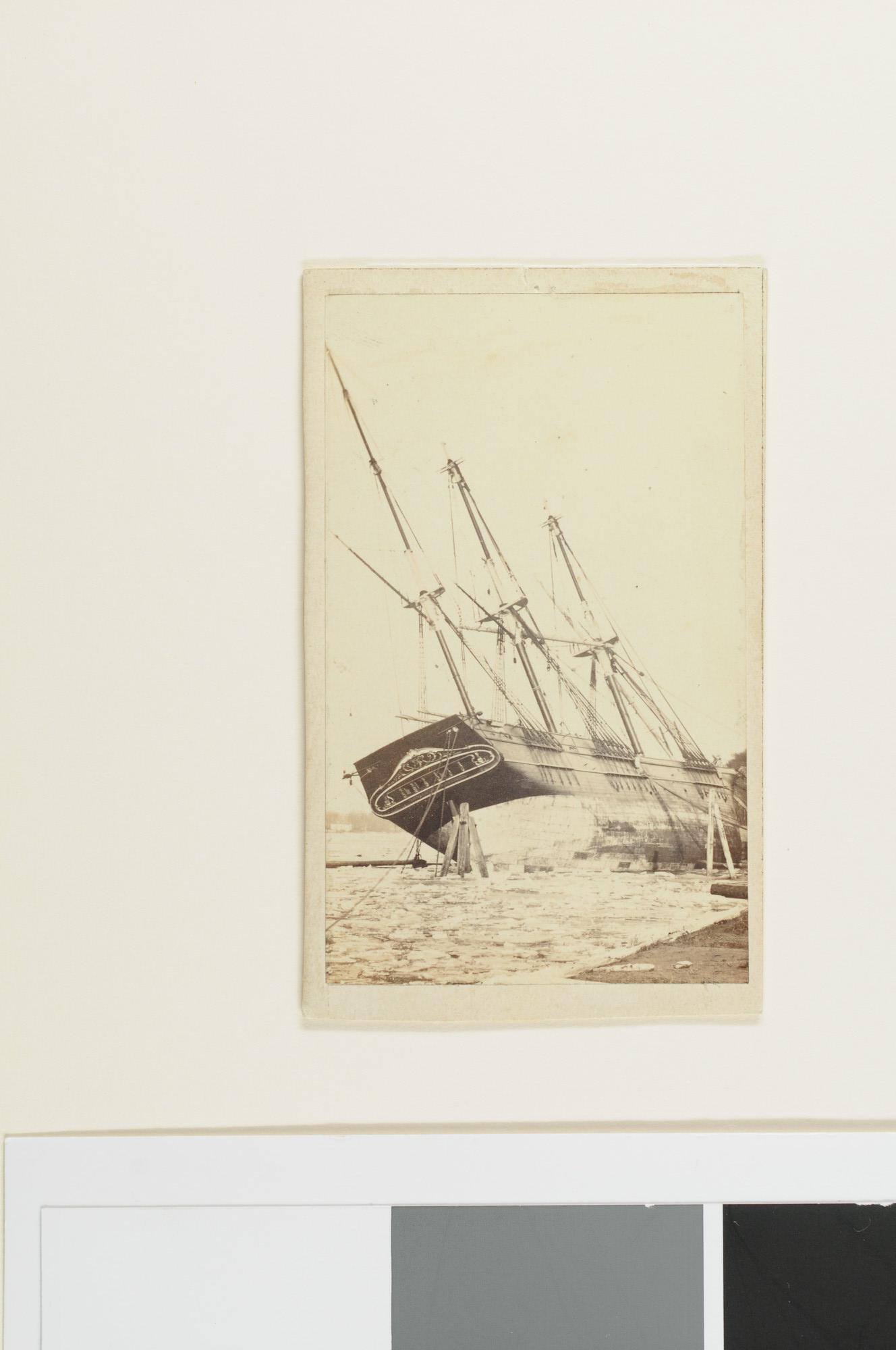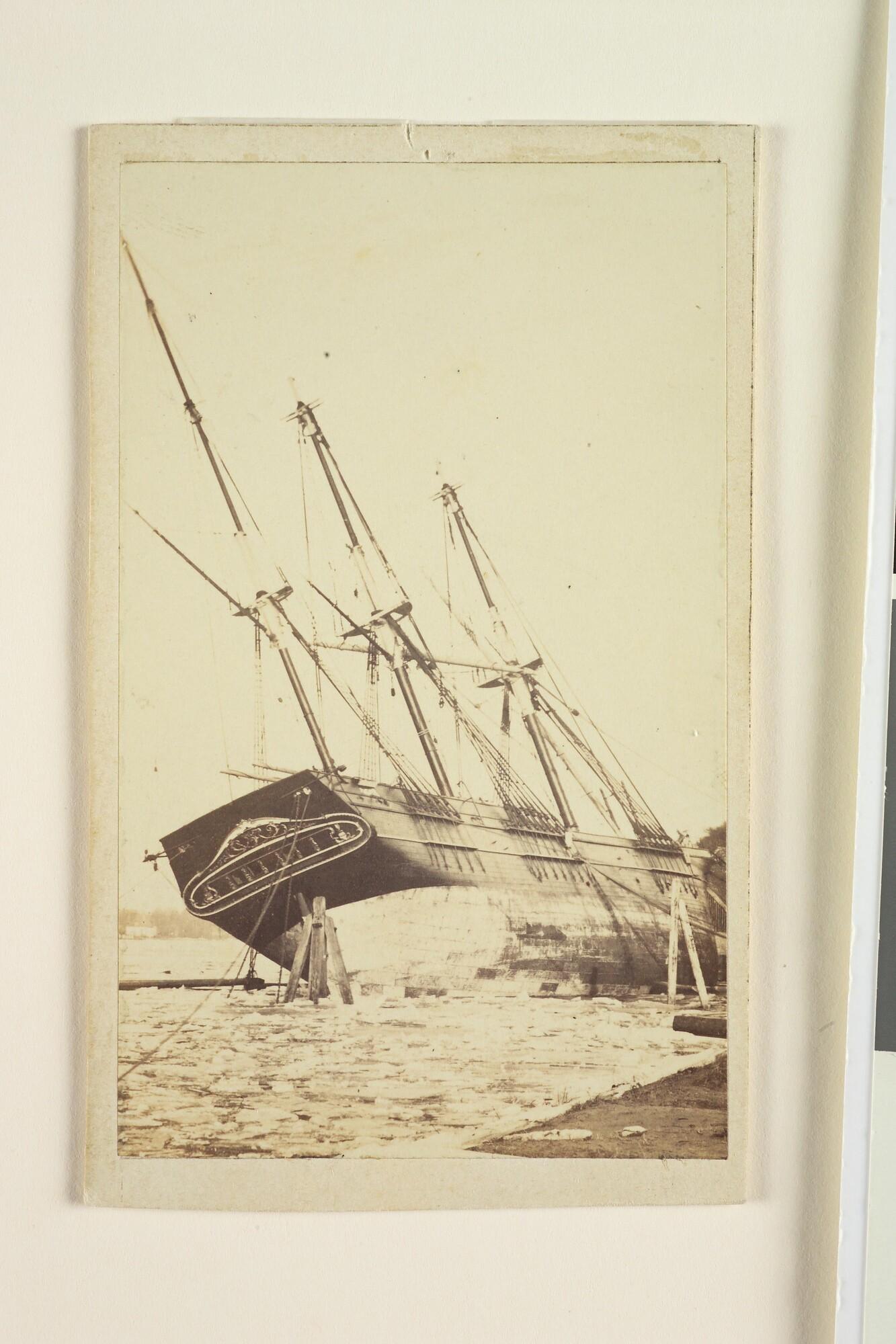 Carte de visite. Een driemast bark zit vast in het ijs op de Maas bij Dordrecht (Achteraanzicht).
