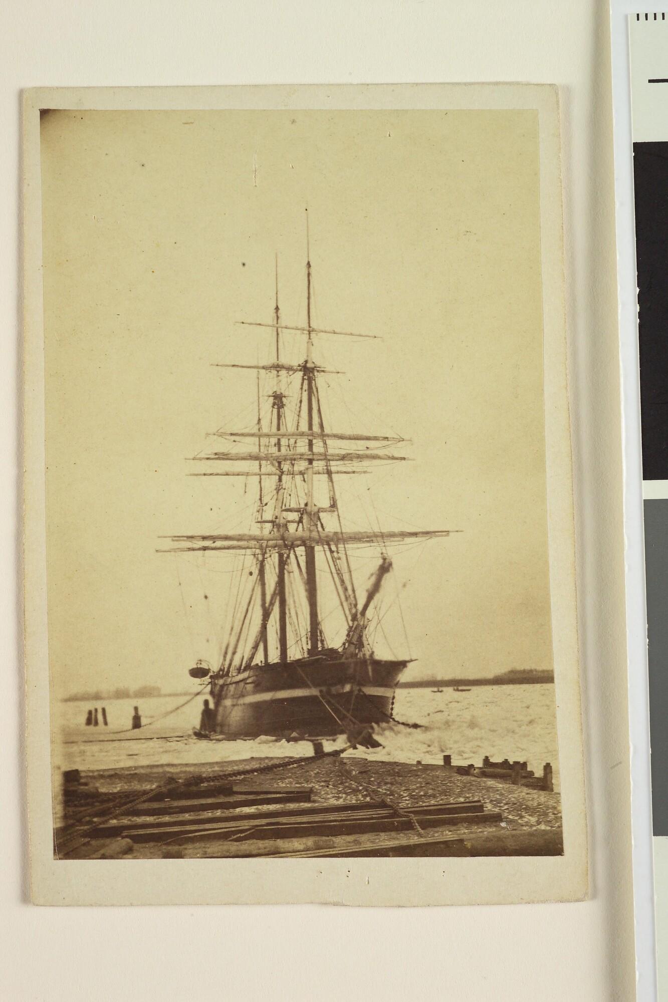 Carte de visite. Een driemast bark zit vast in het ijs op de Maas bij Dordrecht (Vooraanzicht).