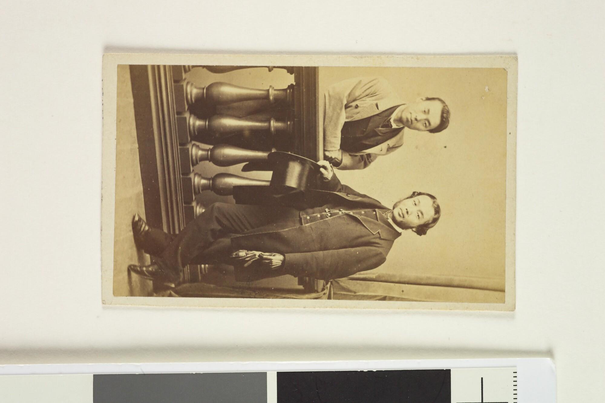 Portretfoto van Akamatsu Daisaburo (Noriyshi) (1841 -1920) en Sawa Tarosaemon. Beide officier van de Japanse marine.