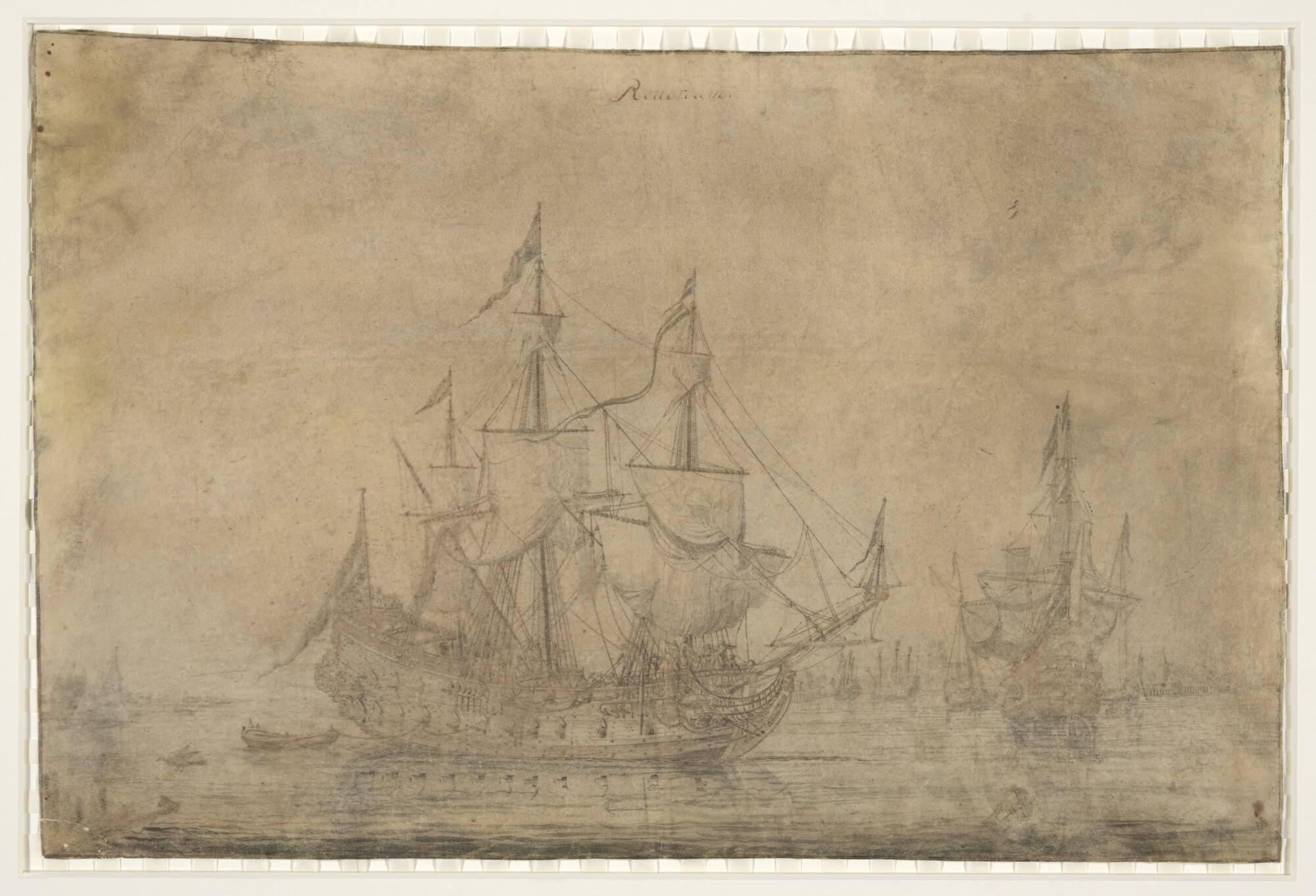De rede van Rotterdam met onder andere een fregatschip en andere schepen.