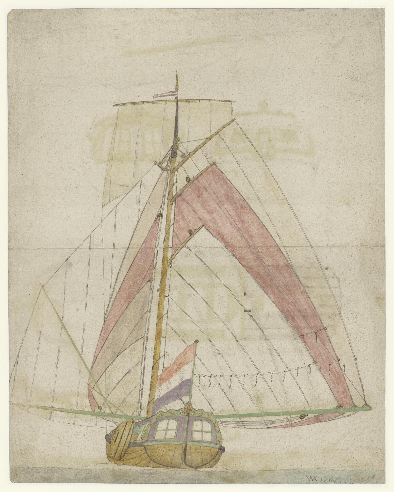 Een spiegelpaviljoen jacht met varianten in zeilvoering, waaronder een topzeil; verso: boven-, voor-, zijaanzicht van een spiegelpaviljoenjacht