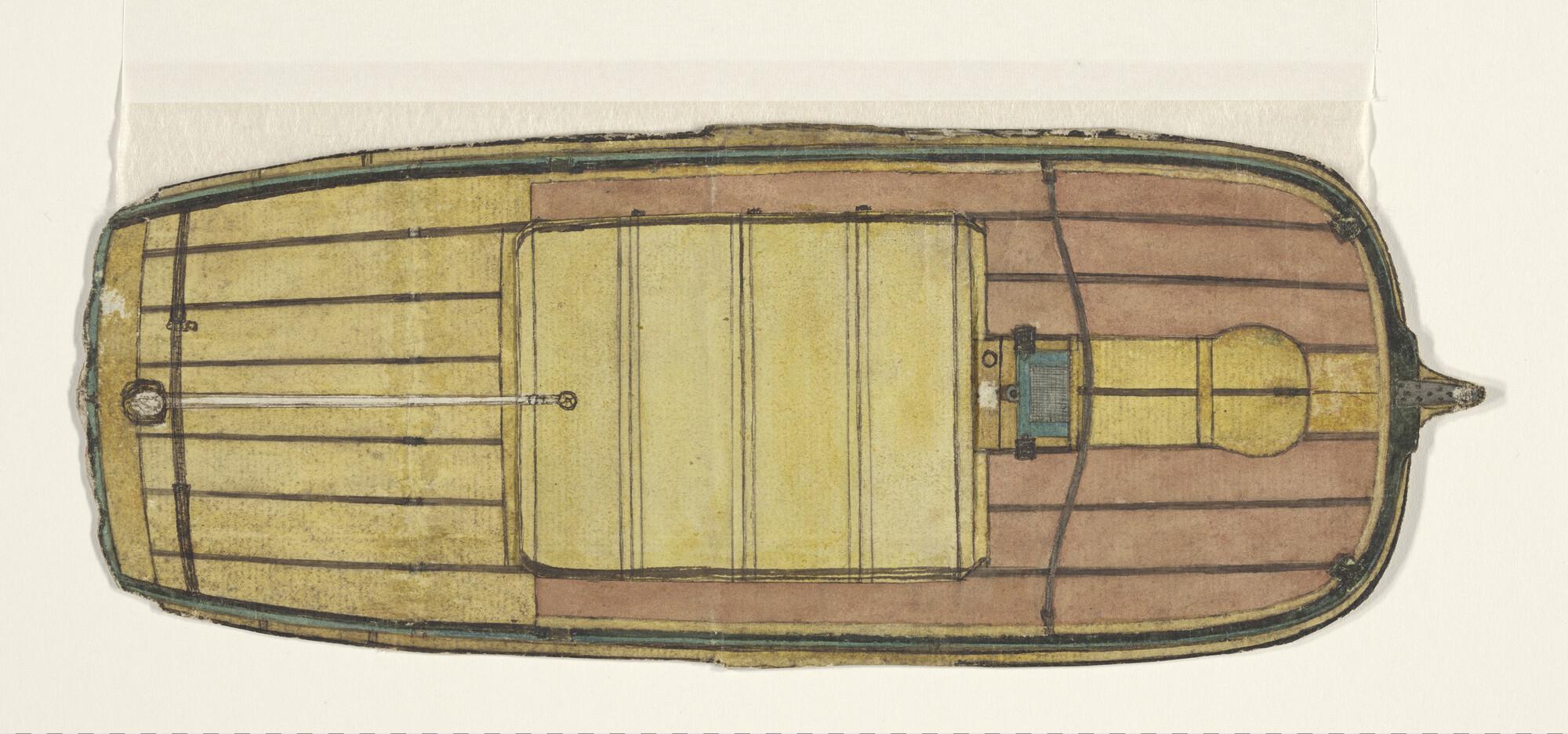 Bovenaanzicht van een spiegelpaviljoenjacht, gedeeltelijk uitklapbare tekening